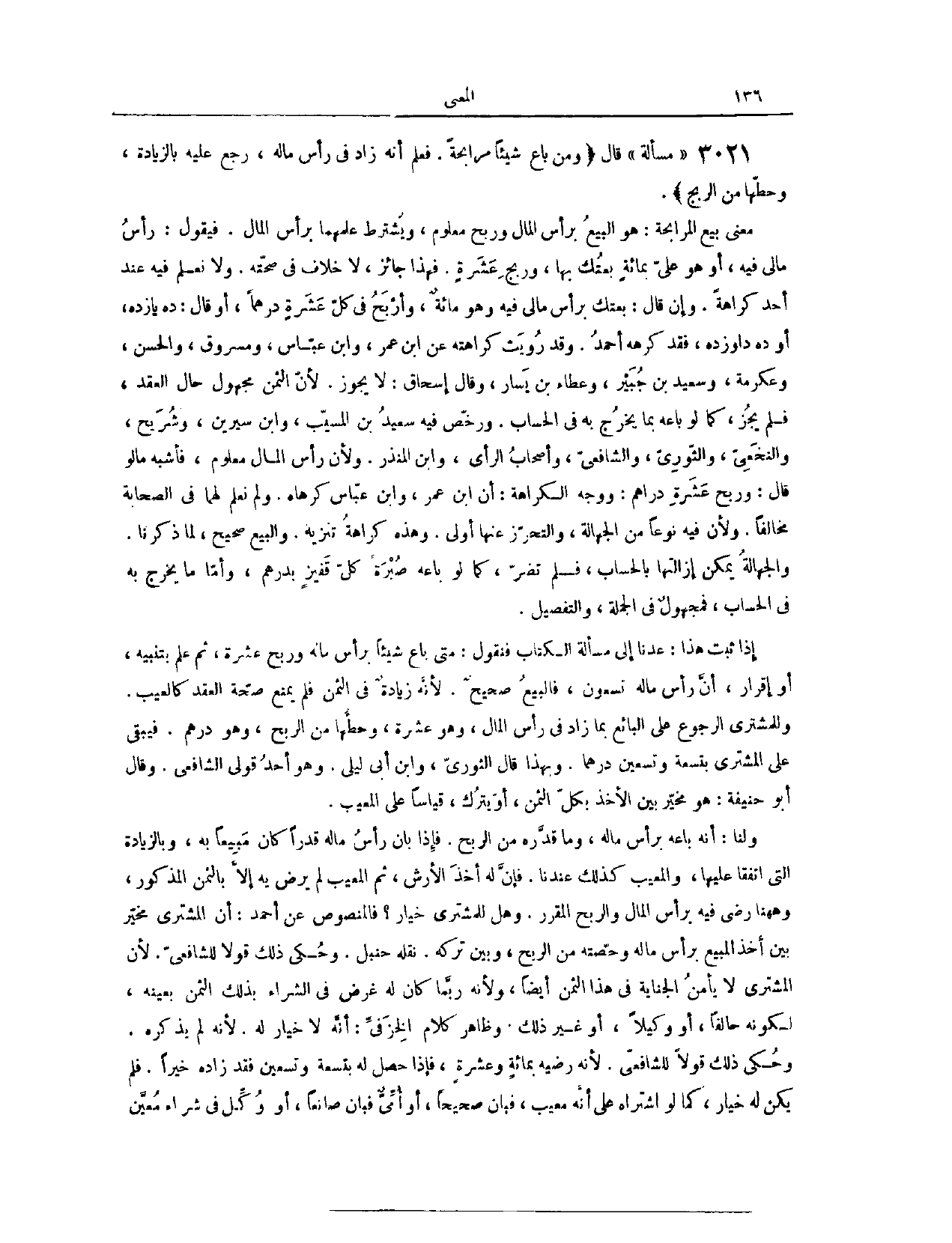 (٣٠٤٩) مَسْأَلَةٌ؛ قَالَ: وَمَنْ بَاعَ شَيْئًا مُرَابَحَةً، فَعَلِمَ أَنَّهُ زَادَ فِي رَأْسِ مَالِهِ، رَجَعَ عَلَيْهِ بِالزِّيَادَةِ وَحَطَّهَا مِنْ الرِّبْحِ مَعْنَى بَيْعِ الْمُرَابَحَةِ، هُوَ الْبَيْعُ بِرَأْسِ الْمَالِ وَرِبْحٍ مَعْلُومٍ، وَيُشْتَرَطُ عِلْمُهُمَا بِرَأْسِ الْمَالِ فَيَقُولُ: رَأْسُ مَالِي فِيهِ أَوْ هُوَ عَلَيَّ بِمِائَةٍ بِعْتُك بِهَا، وَرِبْحُ عَشَرَةٍ، فَهَذَا جَائِزٌ لَا خِلَافَ فِي صِحَّتِهِ، وَلَا نَعْلَمُ فِيهِ عِنْدَ أَحَدٍ كَرَاهَةً. وَإِنْ قَالَ: بِعْتُك بِرَأْسِ مَالِي فِيهِ وَهُوَ مِائَةٌ، وَأَرْبَحُ فِي كُلِّ عَشَرَةٍ دِرْهَمًا، أَوْ قَالَ: ده يازده. أَوْ ده داوزده. فَقَدْ كَرِهَهُ أَحْمَدُ، وَقَدْ رُوِيَتْ كَرَاهَتُهُ عَنْ ابْنِ عُمَرَ، وَابْنِ عَبَّاسٍ، وَمَسْرُوقٍ، وَالْحَسَنِ وَعِكْرِمَةَ، وَسَعِيدِ بْنِ جُبَيْرٍ، وَعَطَاءِ بْنِ يَسَارٍ.