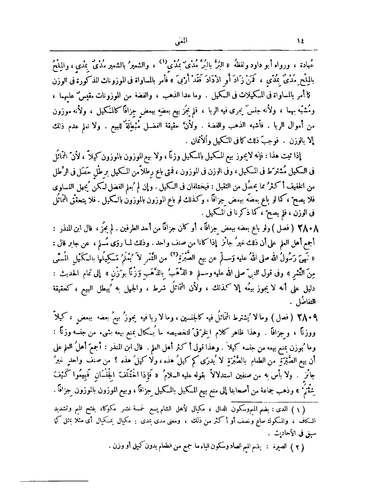 عُبَادَةَ، وَرَوَاهُ أَبُو دَاوُد، وَلَفْظُهُ: «الْبُرُّ بِالْبُرِّ مُدْيٌ بِمُدْيٍ، وَالشَّعِيرُ بِالشَّعِيرِ مُدْيٌ بِمُدْيٍ، وَالْمِلْحُ بِالْمِلْحِ مُدْيٌ بِمُدْيٍ، فَمَنْ زَادَ أَوْ ازْدَادَ فَقَدْ أَرْبَى» . فَأَمَرَ بِالْمُسَاوَاةِ فِي الْمَوْزُونَاتِ الْمَذْكُورَةِ فِي الْوَزْنِ، كَمَا أَمَرَ بِالْمُسَاوَاةِ فِي الْمَكِيلَاتِ فِي الْكَيْلِ، وَمَا عَدَا الذَّهَبَ وَالْفِضَّةَ مِنْ الْمَوْزُونَاتِ مَقِيسٌ عَلَيْهِمَا وَمُشَبَّهٌ بِهِمَا؛ وَلِأَنَّهُ جِنْسٌ يَجْرِي فِيهِ الرِّبَا، فَلَمْ يَجُزْ بَيْعُ بَعْضِهِ بِبَعْضٍ جُزَافًا كَالْمَكِيلِ، وَلِأَنَّهُ مَوْزُونٌ مِنْ أَمْوَالِ الرِّبَا، فَأَشْبَهَ الذَّهَبَ وَالْفِضَّةَ، وَلِأَنَّ حَقِيقَةَ الْفَضْلِ مُبْطِلَةٌ لِلْبَيْعِ، وَلَا نَعْلَمُ عَدَمَ ذَلِكَ إلَّا بِالْوَزْنِ، فَوَجَبَ ذَلِكَ، كَمَا فِي الْمَكِيلِ وَالْأَثْمَانِ.
