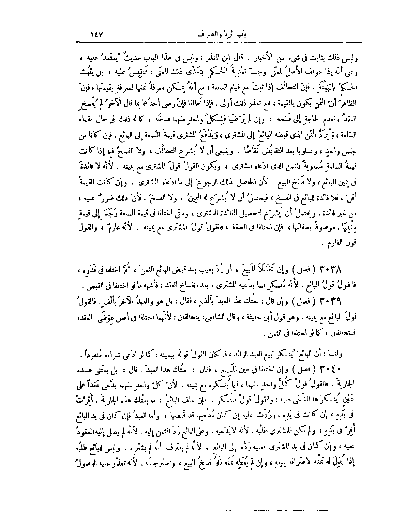 قَالَ ابْنُ الْمُنْذِرِ وَلَيْسَ فِي هَذَا الْبَابِ حَدِيثٌ يُعْتَمَدُ عَلَيْهِ. وَعَلَى أَنَّهُ إذَا خُولِفَ الْأَصْلُ لِمَعْنًى، وَجَبَ تَعْدِيَةُ الْحُكْمِ بِتَعَدِّي ذَلِكَ الْمَعْنَى، فَنَقِيسُ عَلَيْهِ بَلْ يَثْبُتُ الْحُكْمُ بِالْبَيِّنَةِ فَإِنَّ التَّحَالُفَ إذَا ثَبَتَ مَعَ قِيَامِ السِّلْعَةِ مَعَ أَنَّهُ يُمْكِنُ مَعْرِفَةُ ثَمَنِهَا لِلْمَعْرِفَةِ بِقِيمَتِهَا، فَإِنَّ الظَّاهِرَ أَنَّ الثَّمَنَ يَكُونُ بِالْقِيمَةِ، فَمَعَ تَعَذُّرِ ذَلِكَ أَوْلَى.