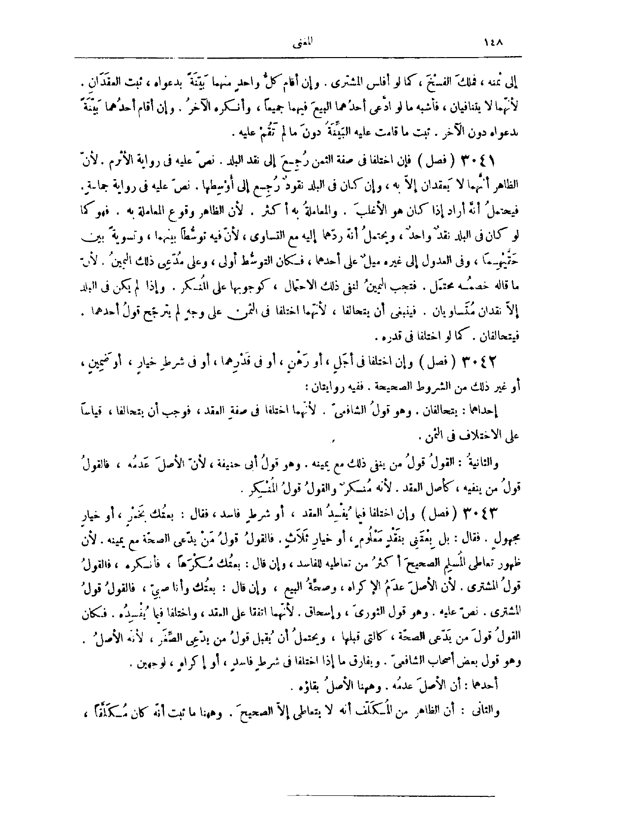 (٣٠٧٢) فَصْلٌ وَإِنْ اخْتَلَفَا فِي صِفَةِ الثَّمَنِ رُجِعَ إلَى نَقْدِ الْبَلَدِ، نَصَّ عَلَيْهِ فِي رِوَايَةِ الْأَثْرَمِ؛ لِأَنَّ الظَّاهِرَ أَنَّهُمَا لَا يَعْقِدَانِ إلَّا بِهِ. وَإِنْ كَانَ فِي الْبَلَدِ نُقُودٌ، رُجِعَ إلَى أَوْسَطِهَا. نَصَّ عَلَيْهِ فِي رِوَايَةِ جَمَاعَةٍ فَيَحْتَمِلُ أَنَّهُ أَرَادَ إذَا كَانَ هُوَ الْأَغْلَبَ، وَالْمُعَامَلَةُ بِهِ أَكْثَرُ؛ لِأَنَّ الظَّاهِرَ وُقُوعُ الْمُعَامَلَةِ بِهِ، فَهُوَ كَمَا لَوْ كَانَ فِي الْبَلَدِ نَقْدٌ وَاحِدٌ. وَيَحْتَمِلُ أَنَّهُ رَدَّهُمَا إلَيْهِ مَعَ التَّسَوِّي؛ لِأَنَّ فِيهِ تَوَسُّطًا بَيْنَهُمَا، وَتَسْوِيَةً بَيْنَ حَقَّيْهِمَا، وَفِي الْعُدُولِ إلَى غَيْرِهِ مَيْلٌ عَلَى أَحَدِهِمَا، فَكَانَ التَّوَسُّطُ أَوْلَى، وَعَلَى مُدَّعِي ذَلِكَ الْيَمِينُ؛ لِأَنَّ مَا قَالَهُ خَصْمُهُ مُحْتَمِلٌ، فَتَجِبُ الْيَمِينُ لِنَفْيِ ذَلِكَ الِاحْتِمَالِ، كَوُجُوبِهَا عَلَى الْمُنْكِرِ.