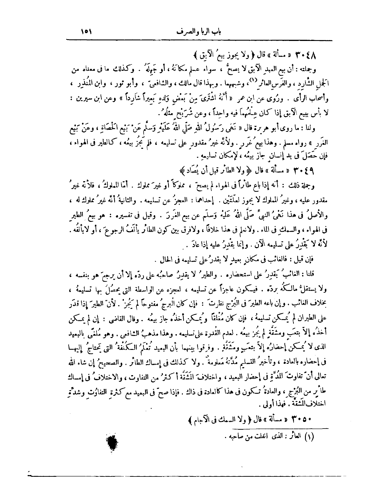 (٣٠٧٩) مَسْأَلَةٌ؛ قَالَ: وَلَا يَجُوزُ بَيْعُ الْآبِقِ. وَجُمْلَتُهُ؛ أَنَّ بَيْعَ الْعَبْدِ الْآبِقِ لَا يَصِحُّ، سَوَاءٌ عَلِمَ مَكَانَهُ، أَوْ جَهِلَهُ. وَكَذَلِكَ مَا فِي مَعْنَاهُ مِنْ الْجَمَلِ الشَّارِدِ، وَالْفَرَسِ الْعَائِرِ، وَشِبْهِهِمَا. وَبِهَذَا قَالَ مَالِكٌ وَالشَّافِعِيُّ وَأَبُو ثَوْرٍ وَابْنُ الْمُنْذِرِ وَأَصْحَابُ الرَّأْيِ. وَرُوِيَ عَنْ ابْنِ عُمَرَ أَنَّهُ اشْتَرَى مِنْ بَعْضِ وَلَدِهِ بَعِيرًا شَارِدًا. وَعَنْ ابْنِ سِيرِينَ لَا بَأْسَ بِبَيْعِ الْآبِقِ، إذَا كَانَ عِلْمُهُمَا فِيهِ وَاحِدًا. وَعَنْ شُرَيْحٍ مِثْلُهُ.