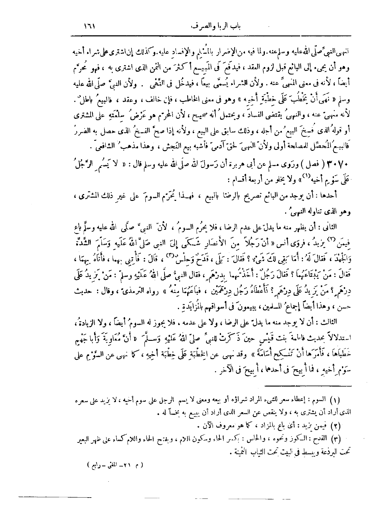 (٣١٠٢) فَصْلٌ وَرَوَى مُسْلِمٌ عَنْ أَبِي هُرَيْرَةَ أَنَّ رَسُولَ اللَّهِ - صَلَّى اللَّهُ عَلَيْهِ وَسَلَّمَ - قَالَ «لَا يَسُمْ الرَّجُلُ عَلَى سَوْمِ أَخِيهِ» وَلَا يَخْلُو مِنْ أَرْبَعَةِ أَقْسَامٍ: أَحَدِهَا، أَنْ يُوجَدَ مِنْ الْبَائِعِ تَصْرِيحٌ بِالرِّضَا بِالْبَيْعِ، فَهَذَا يُحَرِّمُ السَّوْمَ عَلَى غَيْرِ ذَلِكَ الْمُشْتَرِي، وَهُوَ الَّذِي تَنَاوَلَهُ النَّهْيُ. الثَّانِي، أَنْ يَظْهَرَ مِنْهُ مَا يَدُلُّ عَلَى عَدَمِ الرِّضَا فَلَا يَحْرُمُ السَّوْمُ؛ لِأَنَّ النَّبِيَّ - صَلَّى اللَّهُ عَلَيْهِ وَسَلَّمَ - بَاعَ فِي مَنْ يَزِيدُ فَرَوَى أَنَسٌ: «أَنَّ رَجُلًا مِنْ الْأَنْصَارِ شَكَا إلَى النَّبِيِّ - صَلَّى اللَّهُ عَلَيْهِ وَسَلَّمَ - الشِّدَّةَ وَالْجَهْدَ، فَقَالَ لَهُ: أَمَا بَقِيَ لَك شَيْءٌ؟ فَقَالَ بَلَى، قَدَحٌ وَحِلْسٌ، قَالَ: فَأْتِنِي بِهِمَا فَأَتَاهُ بِهِمَا، فَقَالَ مَنْ يَبْتَاعُهُمَا؟ فَقَالَ رَجُلٌ: أَخَذْتُهُمَا بِدِرْهَمٍ. فَقَالَ النَّبِيُّ - صَلَّى اللَّهُ عَلَيْهِ وَسَلَّمَ - مَنْ يَزِيدُ عَلَى دِرْهَمٍ؟ مَنْ يَزِيدُ عَلَى دِرْهَمٍ؟ فَأَعْطَاهُ رَجُلٌ دِرْهَمَيْنِ، فَبَاعَهُمَا مِنْهُ.» . رَوَاهُ التِّرْمِذِيُّ وَقَالَ: حَدِيثٌ حَسَنٌ. وَهَذَا أَيْضًا إجْمَاعُ الْمُسْلِمِينَ، يَبِيعُونَ فِي أَسْوَاقِهِمْ بِالْمُزَايَدَةِ.