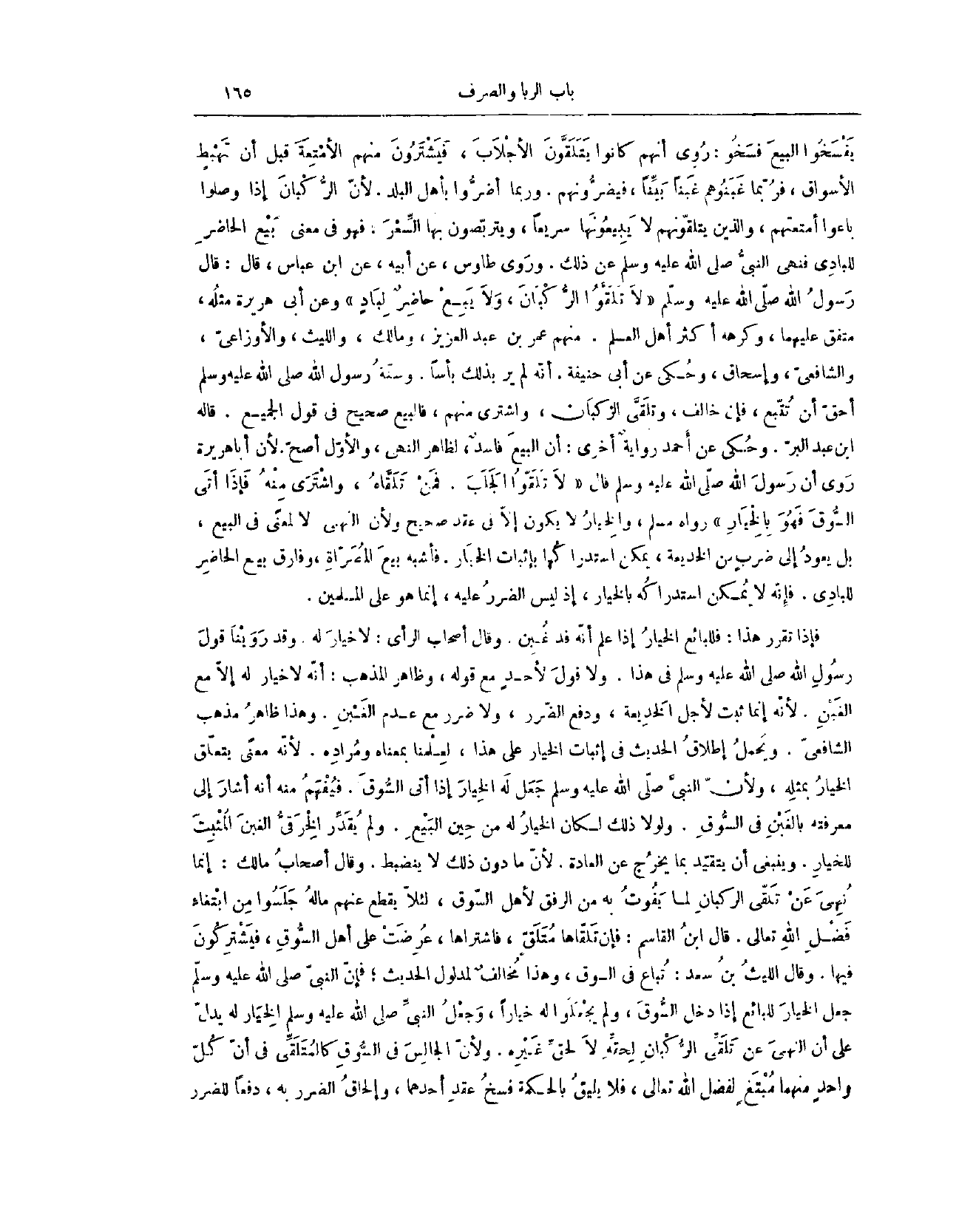وَرَوَى طَاوُسٌ عَنْ أَبِيهِ عَنْ ابْنِ عَبَّاسٍ قَالَ: قَالَ رَسُولُ اللَّهِ: - صَلَّى اللَّهُ عَلَيْهِ وَسَلَّمَ - «لَا تَلَقَّوْا الرُّكْبَانَ، وَلَا يَبِعْ حَاضِرٌ لِبَادٍ» وَعَنْ أَبِي هُرَيْرَةَ مِثْلُهُ، مُتَّفَقٌ عَلَيْهِمَا، وَكَرِهَهُ أَكْثَرُ أَهْلِ الْعِلْمِ، مِنْهُمْ عُمَرُ بْنُ عَبْدِ الْعَزِيزِ وَمَالِكٌ وَاللَّيْثُ وَالْأَوْزَاعِيُّ وَالشَّافِعِيُّ وَإِسْحَاقُ.