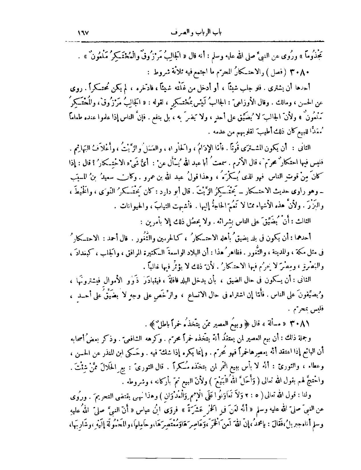 فَظَاهِرُ هَذَا أَنَّ الْبِلَادَ الْوَاسِعَةَ الْكَثِيرَةَ الْمَرَافِقِ وَالْجَلَبِ كَبَغْدَادَ، وَالْبَصْرَةِ وَمِصْرَ، لَا يَحْرُمُ فِيهَا الِاحْتِكَارُ؛ لِأَنَّ ذَلِكَ لَا يُؤَثِّرُ فِيهَا غَالِبًا. الثَّانِي، أَنْ يَكُونَ فِي حَالِ الضَّيِّقِ، بِأَنْ يَدْخُلَ الْبَلَدَ قَافِلَةٌ فَيَتَبَادَرُ ذَوُو الْأَمْوَالِ فَيَشْتَرُونَهَا، وَيُضَيِّقُونَ عَلَى النَّاسِ. فَأَمَّا إنْ اشْتَرَاهُ فِي حَالِ الِاتِّسَاعِ وَالرُّخْصِ، عَلَى وَجْهٍ لَا يُضَيِّقُ عَلَى أَحَدٍ فَلَيْسَ بِمُحَرَّمٍ.