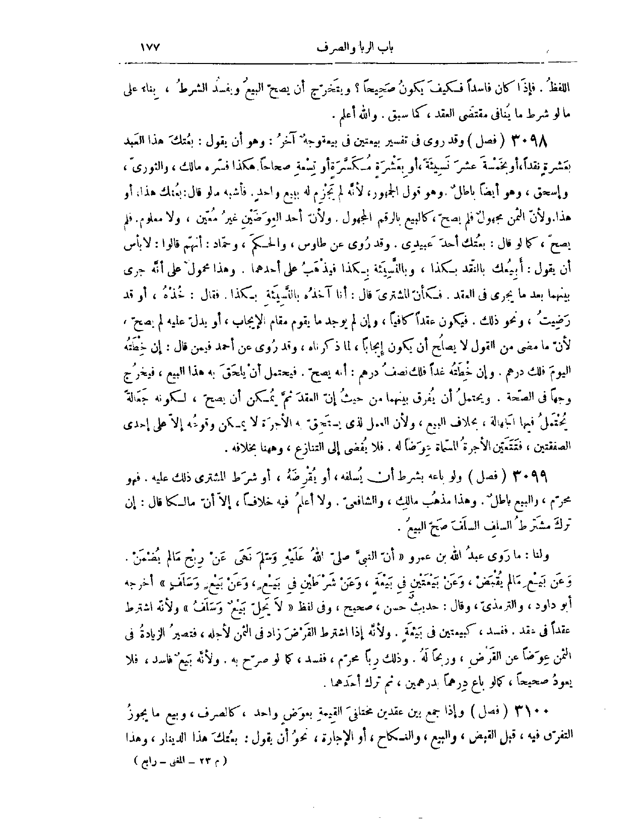 (٣١٣٠) فَصْلٌ وَقَدْ رُوِيَ فِي تَفْسِيرِ بَيْعَتَيْنِ فِي بَيْعَةٍ وَجْهٌ آخَرُ وَهُوَ أَنْ يَقُولَ بِعْتُك هَذَا الْعَبْدَ بِعَشَرَةٍ نَقْدًا أَوْ بِخَمْسَةَ عَشَرَ نَسِيئَةً أَوْ بِعَشَرَةٍ مُكَسَّرَةٍ، أَوْ تِسْعَةً صِحَاحًا.