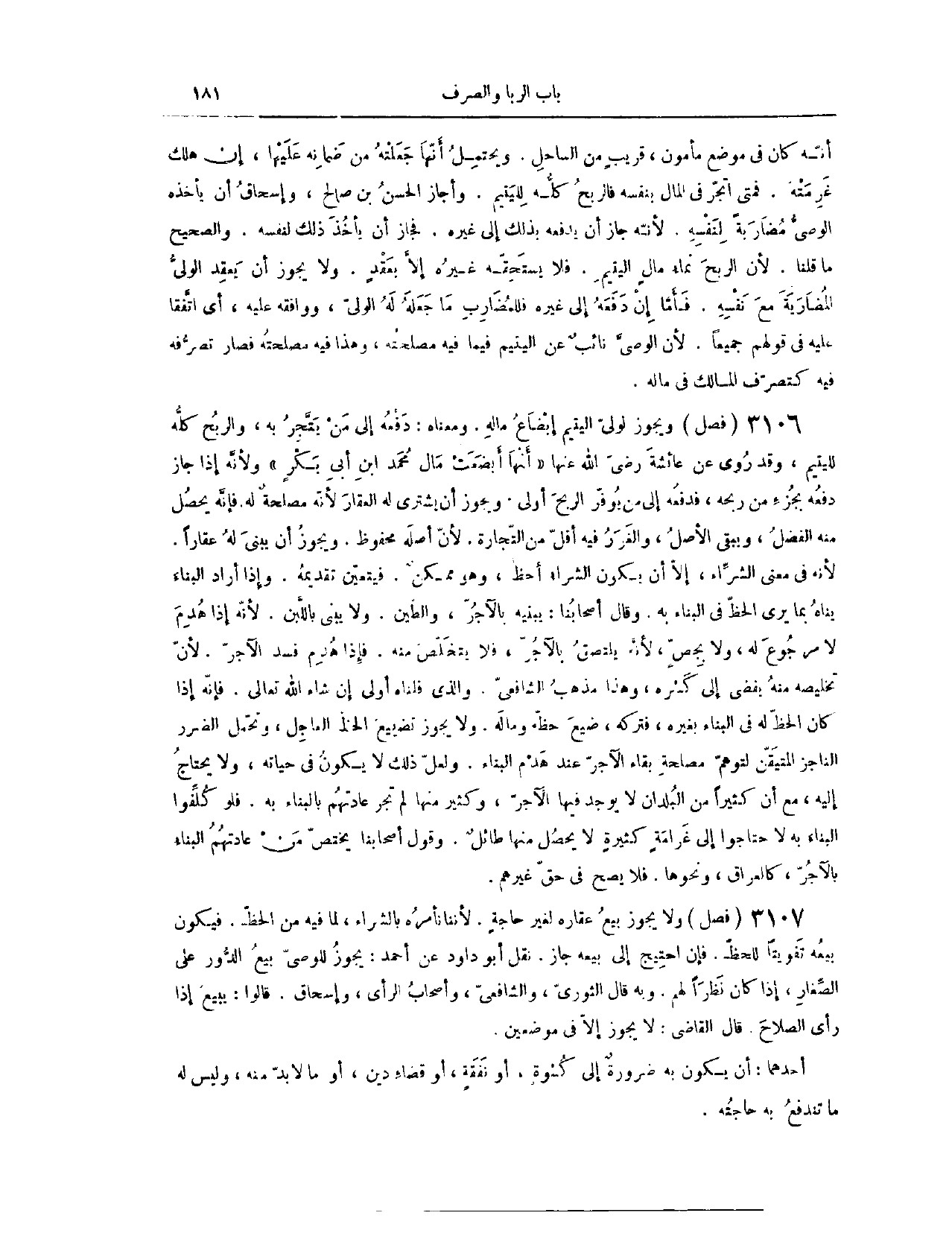 (٣١٣٨) فَصْلٌ: وَيَجُوزُ لِوَلِيِّ الْيَتِيمِ إبْضَاعُ مَالِهِ وَمَعْنَاهُ؛ دَفْعُهُ إلَى مَنْ يَتَّجِرُ بِهِ وَالرِّبْحُ كُلُّهُ لِلْيَتِيمِ وَقَدْ رُوِيَ عَنْ عَائِشَةَ - رَضِيَ اللَّهُ عَنْهَا - أَنَّهَا أَبْضَعَتْ مَالَ مُحَمَّدِ بْنِ أَبِي بَكْرٍ وَلِأَنَّهُ إذَا جَازَ دَفْعُهُ بِجُزْءٍ مِنْ رِبْحِهِ فَدَفْعُهُ إلَى مَنْ يُوَفِّرُ الرِّبْحَ أَوْلَى وَيَجُوزُ أَنْ يَشْتَرِيَ لَهُ الْعَقَارَ لِأَنَّهُ مَصْلَحَةٌ لَهُ؛ فَإِنَّهُ يُحَصِّلُ مِنْهُ الْفَضْلَ وَيَبْقَى الْأَصْلُ وَالْغَرَرُ فِيهِ أَقَلَّ مِنْ التِّجَارَةِ لِأَنَّ أَصْلَهُ مَحْفُوظٌ وَيَجُوزُ أَنْ يَبْنِي لَهُ عَقَارًا لِأَنَّهُ فِي مَعْنَى الشِّرَاءِ إلَّا أَنْ يَكُنْ الشِّرَاءُ أَحَظَّ وَهُوَ مُمْكِنٌ فَيَتَعَيَّنُ تَقْدِيمُهُ وَإِذَا أَرَادَ الْبِنَاءَ بَنَاهُ بِمَا يَرَى الْحَظَّ فِي الْبِنَاءِ بِهِ، وَقَالَ أَصْحَابُنَا يَبْنِيهِ بِالْآجُرِّ وَالطِّينِ وَلَا يَبْنِي بِاللَّبِنِ لِأَنَّهُ إذَا هُدِمَ لَا مَرْجُوعَ لَهُ وَلَا بِجِصٍّ لِأَنَّهُ يَلْتَصِقُ بِالْآجِرِ فَلَا يَتَخَلَّصُ مِنْهُ، فَإِذَا هُدِمَ فَسَدَ الْآجِرُ لِأَنَّ تَخْلِيصَهُ مِنْهُ يُفْضِي إلَى كَسْرِهِ، وَهَذَا مَذْهَبُ الشَّافِعِيِّ، وَاَلَّذِي قُلْنَاهُ أَوْلَى إنْ شَاءَ اللَّهُ تَعَالَى فَإِنَّهُ إذَا كَانَ الْحَظُّ لَهُ فِي الْبِنَاءِ بِغَيْرِهِ فَتَرَكَهُ ضَيَّعَ حَظَّهُ وَمَالَهُ وَلَا يَجُوزُ تَضْيِيعُ الْحَظِّ الْعَاجِلِ وَتَحَمُّلُ الضَّرَرِ النَّاجِزِ الْمُتَيَقَّنِ لِتَوَهُّمِ مَصْلَحَةِ بَقَاءِ الْآجِرِ عِنْدَ هَدْمِ الْبِنَاءِ وَلَعَلَّ ذَلِكَ لَا يَكُونُ فِي حَيَّاتِهِ وَلَا يَحْتَاجُ إلَيْهِ مَعَ أَنَّ كَثِيرًا مِنْ الْبُلْدَانِ لَا يُوجَدُ فِيهَا الْآجِرُ وَكَثِيرٌ مِنْهَا لَمْ تَجْرِ عَادَتْهُمْ بِالْبِنَاءِ بِهِ، فَلَوْ كُلِّفُوا الْبِنَاءَ بِهِ لَاحْتَاجُوا إلَى غَرَامَةٍ كَثِيرَةٍ لَا يَحْصُلُ مِنْهَا طَائِلٌ وَقَوْلُ أَصْحَابِنَا يَخْتَصُّ مَنْ عَادَتْهُمْ الْبِنَاءُ بِالْآجِرِ كَالْعِرَاقِ وَنَحْوِهَا فَلَا يَصِحُّ فِي حَقِّ غَيْرِهِمْ.