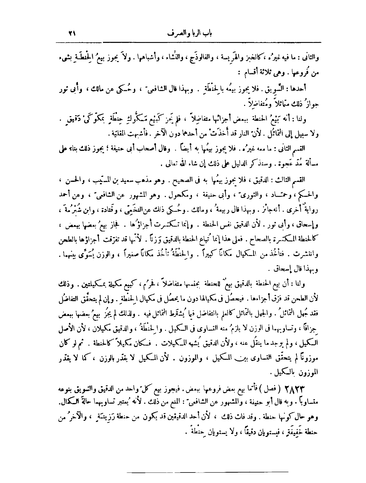 (٢٨٢٤) فَصْلٌ: فَأَمَّا بَيْعُ بَعْضِ فُرُوعِهَا بِبَعْضٍ، فَيَجُوزُ بَيْعُ كُلِّ وَاحِدٍ مِنْ الدَّقِيقِ وَالسَّوِيقِ بِنَوْعِهِ مُتَسَاوِيًا، وَبِهِ قَالَ أَبُو حَنِيفَةَ. وَالْمَشْهُورُ عَنْ الشَّافِعِيِّ الْمَنْعُ مِنْ ذَلِكَ؛ لِأَنَّهُ يَعْتَبِرُ تَسَاوِيهِمَا حَالَةَ الْكَمَالِ، وَهُوَ حَالُ كَوْنِهَا حِنْطَةً، وَقَدْ فَاتَ ذَلِكَ؛ لِأَنَّ أَحَدَ الدَّقِيقَيْنِ قَدْ يَكُونُ مِنْ حِنْطَةٍ رَزِينَةٍ، وَالْآخَرَ مِنْ حِنْطَةٍ خَفِيفَةٍ، فَيَسْتَوِيَانِ دَقِيقًا، وَلَا يَسْتَوِيَانِ حِنْطَةً.