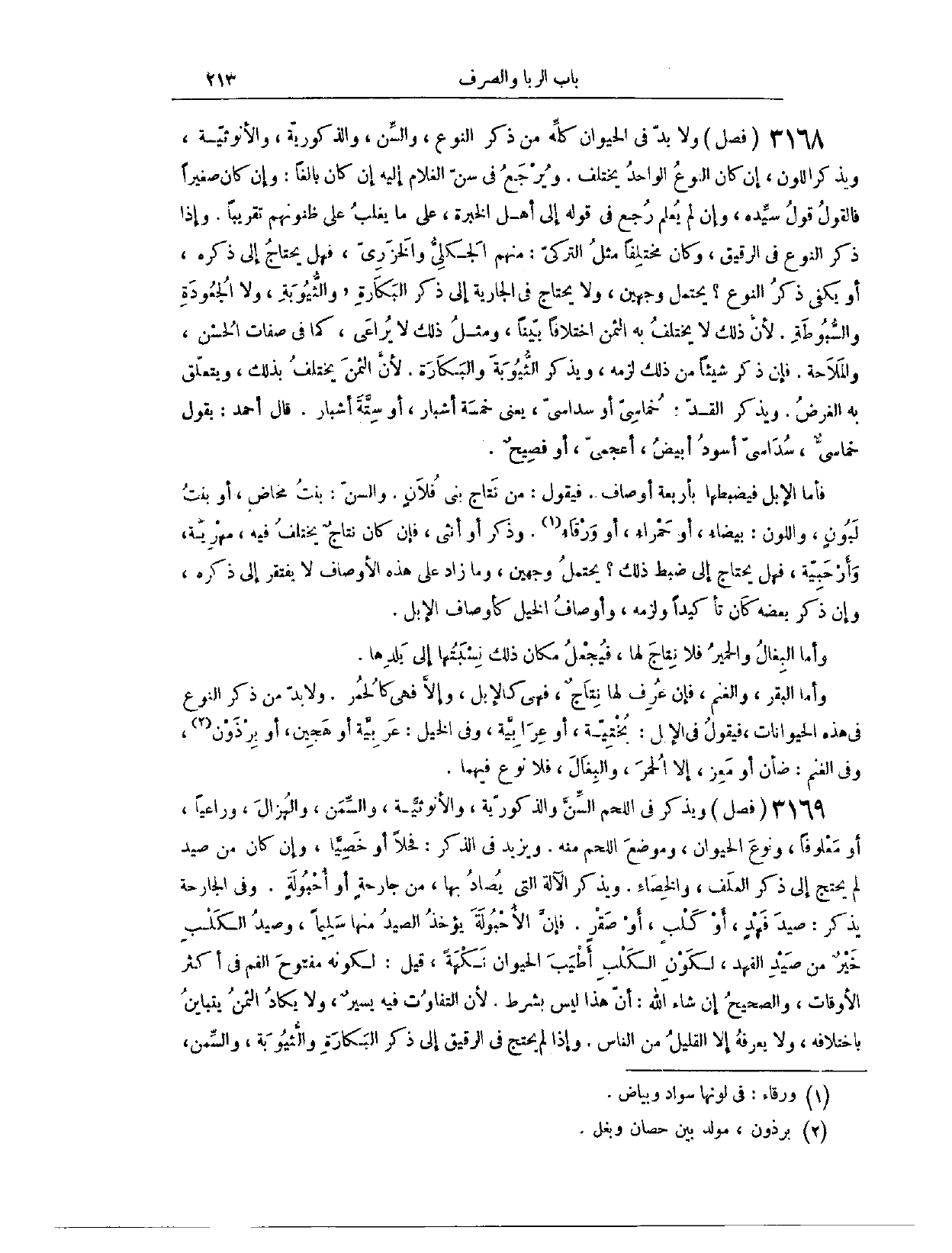 (٣٢٠٦) فَصْلٌ: وَلَا بُدَّ فِي الْحَيَوَانِ كُلِّهِ مِنْ ذِكْرِ النَّوْعِ، وَالسِّنِّ، وَالذُّكُورِيَّةِ، وَالْأُنُوثِيَّةِ، وَيُذْكَرُ اللَّوْنُ إذَا كَانَ النَّوْعُ الْوَاحِدُ يَخْتَلِفُ، وَيَرْجِعُ فِي سِنِّ الْغُلَامِ إلَيْهِ إنْ كَانَ بَالِغًا، وَإِنْ كَانَ صَغِيرًا فَالْقَوْلُ قَوْلُ سَيِّدِهِ، وَإِنْ لَمْ يَعْلَمْ رَجَعَ فِي قَوْلِهِ إلَى أَهْلِ الْخِبْرَةِ، عَلَى مَا يَغْلِبُ عَلَى ظُنُونِهِمْ تَقْرِيبًا. وَإِذَا ذَكَرَ النَّوْعَ فِي الرَّقِيقِ وَكَانَ مُخْتَلِفًا، مِثْلَ التُّرْكِيِّ؛ مِنْهُمْ الْجِكِلِيُّ وَالْخَزَرِيُّ، فَهَلْ يَحْتَاجُ إلَى ذِكْرِهِ، أَوْ يَكْفِي ذِكْرُ النَّوْعِ؟ يَحْتَمِلُ وَجْهَيْنِ. وَلَا يَحْتَاجُ فِي الْجَارِيَةِ إلَى ذِكْرِ الْبَكَارَةِ وَالثُّيُوبَةِ وَلَا الْجُعُودَةِ وَالسُّبُوطَةِ؛ لِأَنَّ ذَلِكَ لَا يَخْتَلِفُ بِهِ الثَّمَنُ اخْتِلَافًا بَيِّنًا، وَمِثْلُ ذَلِكَ لَا يُرَاعَى، كَمَا فِي صِفَاتِ الْحُسْنِ وَالْمَلَاحَةِ، فَإِنْ ذَكَرَ شَيْئًا مِنْ ذَلِكَ، لَزِمَهُ. وَيَذْكُرُ الثُّيُوبَةَ وَالْبَكَارَةَ؛ لِأَنَّ الثَّمَنَ يَخْتَلِفُ بِذَلِكَ وَيَتَعَلَّقُ بِهِ الْغَرَضُ.