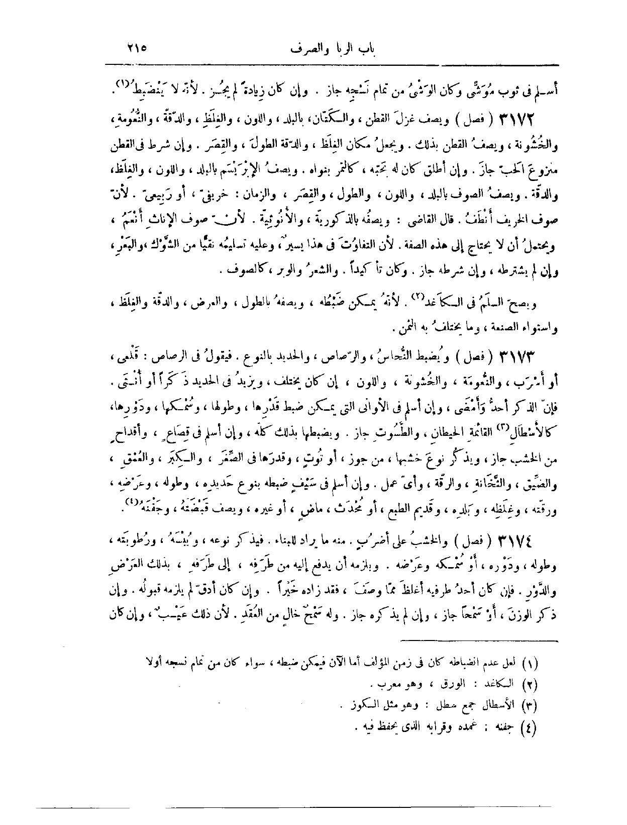 (٣٢١١) فَصْلٌ: وَيَضْبِطُ النُّحَاسُ، وَالرَّصَاصُ، وَالْحَدِيدُ بِالنَّوْعِ، فَيَقُولُ فِي الرَّصَاصِ: قَلْعِيٌّ أَوْ أُسْرُبٌ. وَالنُّعُومَةُ وَالْخُشُونَةُ، وَاللَّوْنُ إنْ كَانَ يَخْتَلِفُ. وَيَزِيدُ فِي الْحَدِيدِ ذَكَرًا أَوْ أُنْثَى، فَإِنَّ الذَّكَرَ أَحَدُّ وَأَمْضَى. وَإِنْ أَسْلَمَ فِي الْأَوَانِي الَّتِي يُمْكِنُ ضَبْطُ قَدْرِهَا وَطُولِهَا وَسُمْكِهَا وَدُورِهَا، كَالْأَسْطَالِ الْقَائِمَةِ الْحِيطَانِ، وَالطُّسُوتِ، جَازَ. وَيَضْبِطُهَا بِذَلِكَ كُلِّهِ. وَإِنْ أَسْلَمَ فِي قِصَاعٍ وَأَقْدَاحٍ مِنْ الْخَشَبِ، جَازَ، وَيَذْكُرُ نَوْعَ خَشَبِهَا مِنْ جَوْزٍ، أَوْ تُوتٍ، وَقَدْرَهَا فِي الصِّغَرِ وَالْكِبَرِ، وَالْعُمْقِ وَالضِّيقِ، وَالثَّخَانَةِ وَالرِّقَّةِ وَأَيِّ عَمَلٍ. وَإِنْ أَسْلَمَ فِي سَيْفٍ، ضَبَطَهُ بِنَوْعِ حَدِيدِهِ، وَطُولِهِ وَعَرْضِهِ، وَرِقَّتِهِ وَغِلَظِهِ، وَبَلَدِهِ، وَقَدِيمِ الطَّبْعِ أَوْ مُحْدَثٍ، مَاضٍ أَوْ غَيْرِهِ، وَيَصِفُ قَبْضَتَهُ وَجَفْنَهُ.