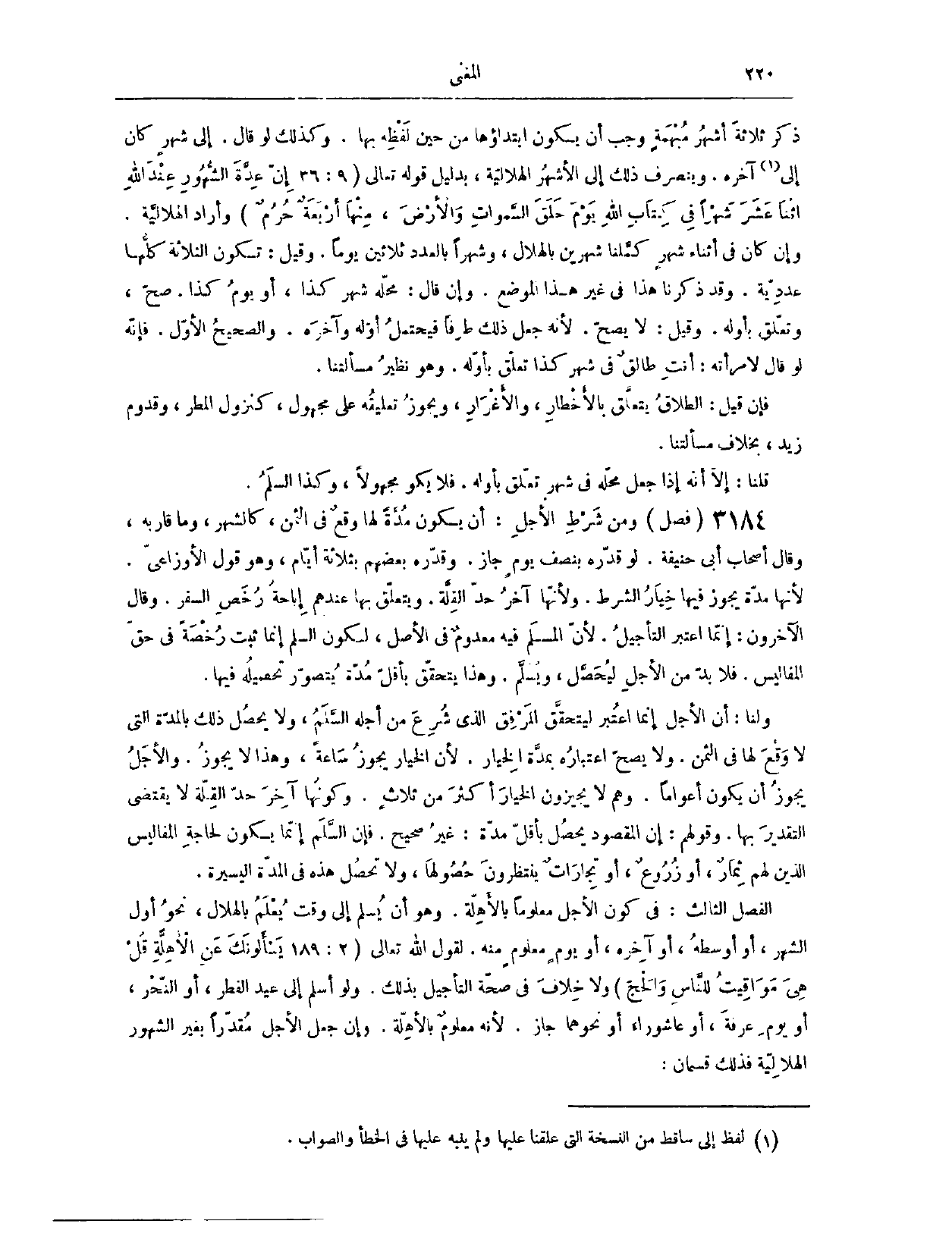 (٣٢٢٤) فَصْلٌ: وَمِنْ شَرْطِ الْأَجَلِ أَنْ يَكُونَ مُدَّةً لَهَا وَقْعٌ فِي الثَّمَنِ، كَالشَّهْرِ وَمَا قَارَبَهُ. وَقَالَ أَصْحَابُ أَبِي حَنِيفَةَ: لَوْ قَدَّرَهُ بِنِصْفِ يَوْمٍ، جَازَ. وَقَدَّرَهُ بَعْضُهُمْ بِثَلَاثَةِ أَيَّامٍ، وَهُوَ قَوْلُ الْأَوْزَاعِيِّ؛ لِأَنَّهَا مُدَّةٌ يَجُوزُ فِيهَا خِيَارُ الشَّرْطِ، وَلِأَنَّهَا آخِرُ حَدِّ الْقِلَّةِ، وَيَتَعَلَّقُ بِهَا عِنْدَهُمْ إبَاحَةُ رُخَصِ السَّفَرِ. وَقَالَ الْآخَرُونَ: إنَّمَا اُعْتُبِرَ التَّأْجِيلُ لِأَنَّ الْمُسْلَمَ فِيهِ مَعْدُومٌ فِي الْأَصْلِ، لِكَوْنِ السَّلَمِ إنَّمَا ثَبَتَ رُخْصَةً فِي حَقِّ الْمَفَالِيسِ، فَلَا بُدَّ مِنْ الْأَجَلِ لِيَحْصُلَ وَيُسَلَّمَ؛ وَهَذَا يَتَحَقَّقُ بِأَقَلِّ مُدَّةٍ يَتَصَوَّرُ تَحْصِيلُهُ فِيهَا وَلَنَا أَنَّ الْأَجَلَ إنَّمَا اُعْتُبِرَ لِيَتَحَقَّقَ الْمَرْفِقُ الَّذِي شُرِعَ مِنْ أَجْلِهِ السَّلَمُ، وَلَا يَحْصُلُ ذَلِكَ بِالْمُدَّةِ الَّتِي لَا وَقْعَ لَهَا فِي الثَّمَنِ، وَلَا يَصِحُّ اعْتِبَارُهُ بِمُدَّةِ الْخِيَارِ؛ لِأَنَّ الْخِيَارَ يَجُوزُ سَاعَةً، وَهَذَا لَا يَجُوزُ، وَالْأَجَلُ يَجُوزُ أَنْ يَكُونَ أَعْوَامًا، وَهُمْ لَا يُجِيزُونَ الْخِيَارَ أَكْثَرِ مِنْ ثَلَاثٍ، وَكَوْنُهَا آخِرَ حَدِّ الْقِلَّةِ، لَا يَقْتَضِي التَّقْدِيرَ بِهَا.