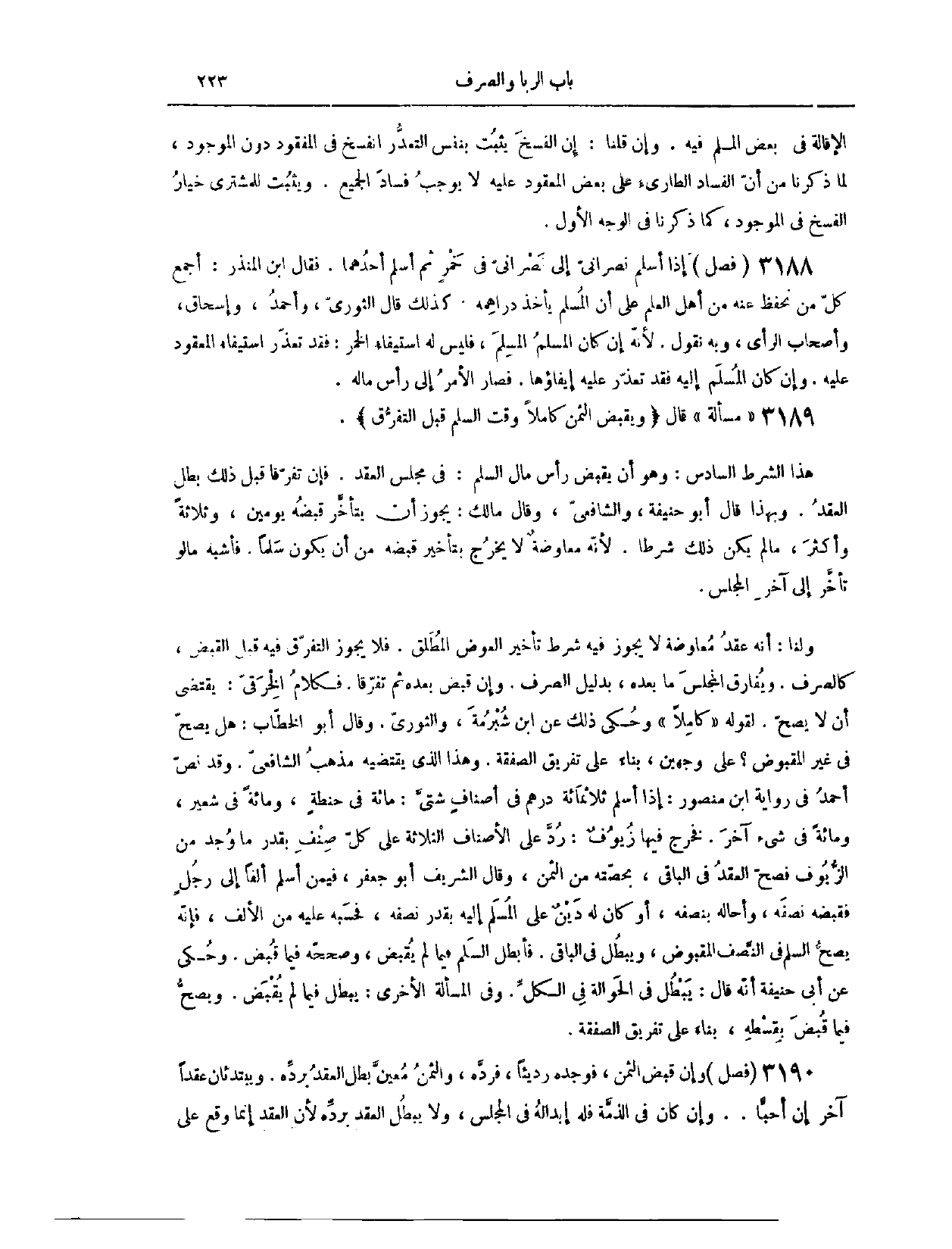 (٣٢٣٠) فَصْلٌ: إذَا أَسْلَمَ نَصْرَانِيٌّ إلَى نَصْرَانِيٍّ فِي خَمْرٍ، ثُمَّ أَسْلَمَ أَحَدُهُمَا. فَقَالَ ابْنُ الْمُنْذِرِ: أَجْمَعَ كُلُّ مِنْ نَحْفَظُ عَنْهُ مِنْ أَهْلِ الْعِلْمِ، عَلَى أَنَّ الْمُسْلِمَ يَأْخُذُ دَرَاهِمَهُ. كَذَلِكَ قَالَ الثَّوْرِيُّ، وَأَحْمَدُ، وَإِسْحَاقُ، وَأَصْحَابُ الرَّأْيِ. وَبِهِ نَقُولُ؛ لِأَنَّهُ إنْ كَانَ الْمُسْلِمُ الْمُسَلِّمَ فَلَيْسَ لَهُ اسْتِيفَاءُ الْخَمْرِ، فَقَدْ تَعَذَّرَ اسْتِيفَاءُ الْمَعْقُودِ عَلَيْهِ، وَإِنْ كَانَ الْمُسْلَمَ إلَيْهِ فَقَدْ تَعَذَّرَ عَلَيْهِ إيفَاؤُهَا، فَصَارَ الْأَمْرُ إلَى رَأْسِ مَالِهِ.