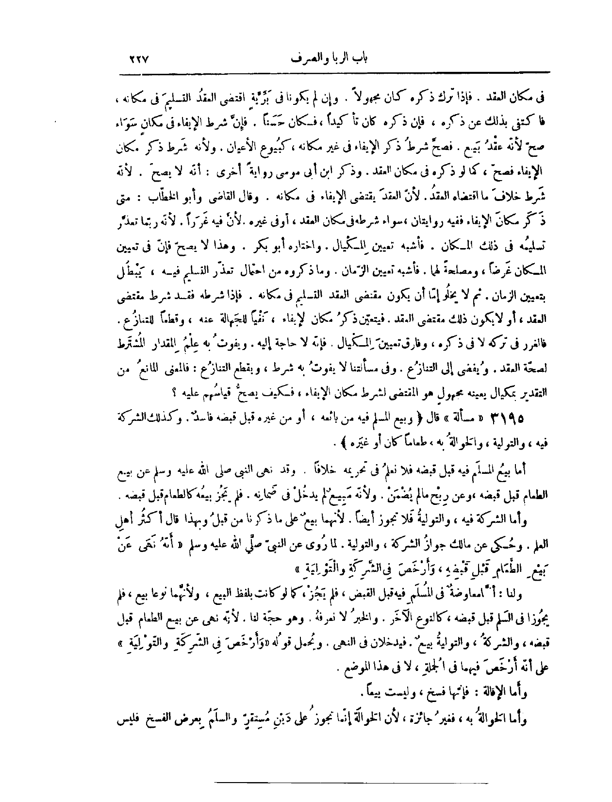 (٣٢٣٧) مَسْأَلَةٌ؛ قَالَ: (وَبَيْعُ الْمُسْلَمِ فِيهِ مِنْ بَائِعِهِ، أَوْ مِنْ غَيْرِهِ، قَبْلَ قَبْضِهِ، فَاسِدٌ. وَكَذَلِكَ الشَّرِكَةُ فِيهِ، وَالتَّوْلِيَةُ، وَالْحَوَالَةُ بِهِ، طَعَامًا كَانَ أَوْ غَيْرَهُ) أَمَّا بَيْعُ الْمُسْلَمِ فِيهِ قَبْلَ قَبْضِهِ، فَلَا نَعْلَمُ فِي تَحْرِيمِهِ خِلَافًا، وَقَدْ «نَهَى النَّبِيُّ - صَلَّى اللَّهُ عَلَيْهِ وَسَلَّمَ - عَنْ بَيْعِ الطَّعَامِ قَبْلَ قَبْضِهِ» ، وَعَنْ رِبْحِ مَا لَمْ يُضْمَنْ. وَلِأَنَّهُ مَبِيعٌ لَمْ يَدْخُلْ فِي ضَمَانِهِ، فَلَمْ يَجُزْ بَيْعُهُ، كَالطَّعَامِ قَبْلَ قَبْضِهِ.