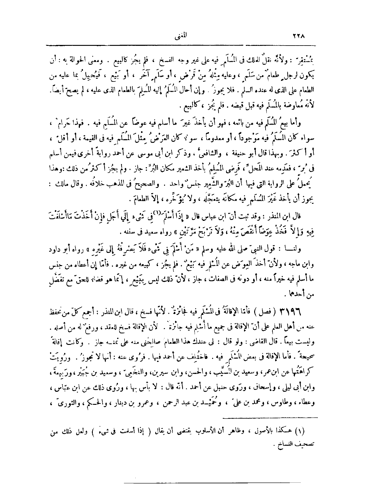 (٣٢٣٨) فَصْلٌ فَأَمَّا. الْإِقَالَةُ فِي الْمُسْلَمِ فِيهِ، فَجَائِزَةٌ، لِأَنَّهَا فَسْخٌ. قَالَ ابْنُ الْمُنْذِرِ: أَجْمَعَ كُلُّ مَنْ نَحْفَظُ عَنْهُ مِنْ أَهْلِ الْعِلْمِ، عَلَى أَنَّ الْإِقَالَةَ فِي جَمِيعِ مَا أَسْلَمَ فِيهِ جَائِزَةٌ؛ لِأَنَّ الْإِقَالَةَ فَسْخٌ لِلْعَقْدِ، وَرَفْعٌ لَهُ مِنْ أَصْلِهِ، وَلَيْسَتْ بَيْعًا. قَالَ الْقَاضِي: وَلَوْ قَالَ: لِي عِنْدَك هَذَا الطَّعَامُ، صَالِحْنِي مِنْهُ عَلَى ثَمَنِهِ. جَازَ، وَكَانَتْ إقَالَةً صَحِيحَةً.