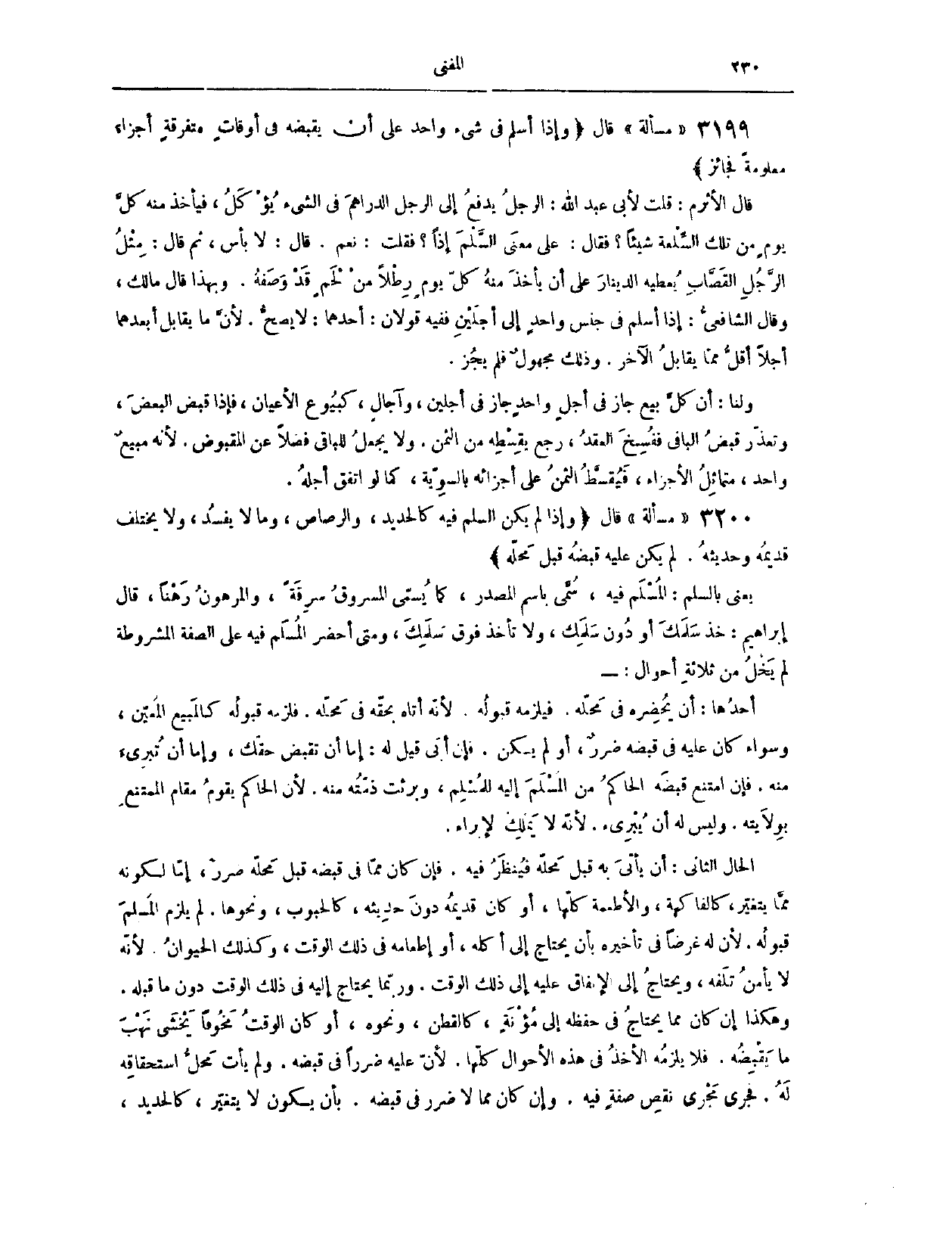 (٣٢٤١) مَسْأَلَةٌ؛ قَالَ: (وَإِذَا أَسْلَمَ فِي شَيْءٍ وَاحِدٍ، عَلَى أَنْ يَقْبِضَهُ فِي أَوْقَاتٍ مُتَفَرِّقَةٍ أَجْزَاءً مَعْلُومَةً، فَجَائِزٌ) قَالَ الْأَثْرَمُ: قُلْت لِأَبِي عَبْدِ اللَّهِ: الرَّجُلُ يَدْفَعُ إلَى الرَّجُلِ الدَّرَاهِمَ فِي الشَّيْءِ يُؤْكَلُ، فَيَأْخُذُ مِنْهُ كُلَّ يَوْمٍ مِنْ تِلْكَ السِّلْعَةِ شَيْئًا؟ فَقَالَ: عَلَى مَعْنَى السَّلَمِ إذًا؟ فَقُلْت: نَعَمْ. قَالَ: لَا بَأْسَ. ثُمَّ قَالَ: مِثْلُ الرَّجُلِ الْقَصَّابِ، يُعْطِيه الدِّينَارَ عَلَى أَنْ يَأْخُذَ مِنْهُ كُلَّ يَوْمٍ رِطْلًا مِنْ لَحْمٍ قَدْ وَصَفَهُ. وَبِهَذَا قَالَ مَالِكٌ. وَقَالَ الشَّافِعِيُّ: إذَا أَسْلَمَ فِي جِنْسٍ وَاحِدٍ إلَى أَجَلَيْنِ، فَفِيهِ قَوْلَانِ: أَحَدُهُمَا: لَا يَصِحُّ؛ لِأَنَّ مَا يُقَابِلُ أَبْعَدَهُمَا أَجَلًا أَقَلُّ مِمَّا يُقَابِلُ الْآخَرَ، وَذَلِكَ مَجْهُولٌ، فَلَمْ يَجُزْ.