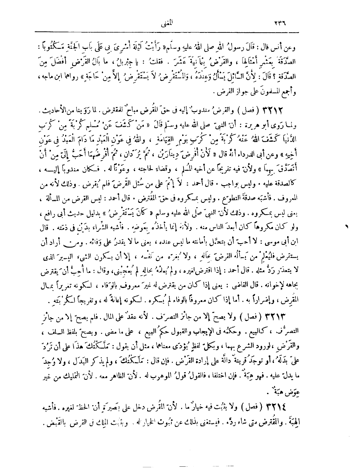 وَعَنْ أَنَسٍ، قَالَ: قَالَ رَسُولُ اللَّهِ - صَلَّى اللَّهُ عَلَيْهِ وَسَلَّمَ -: «رَأَيْت لَيْلَةَ أُسْرِيَ بِي عَلَى بَابِ الْجَنَّةِ مَكْتُوبًا: الصَّدَقَةُ بِعَشْرِ أَمْثَالِهَا، وَالْقَرْضُ بِثَمَانِيَةَ عَشْرَ. فَقُلْت: يَا جِبْرِيلُ، مَا بَالُ الْقَرْضِ أَفْضَلُ مِنْ الصَّدَقَةِ؟ . قَالَ: لِأَنَّ السَّائِلَ يَسْأَلُ وَعِنْدَهُ، وَالْمُسْتَقْرِضُ لَا يَسْتَقْرِضُ إلَّا مِنْ حَاجَةٍ.» رَوَاهُمَا ابْنُ مَاجَهْ.، وَأَجْمَعَ الْمُسْلِمُونَ عَلَى جَوَازِ الْقَرْضِ.