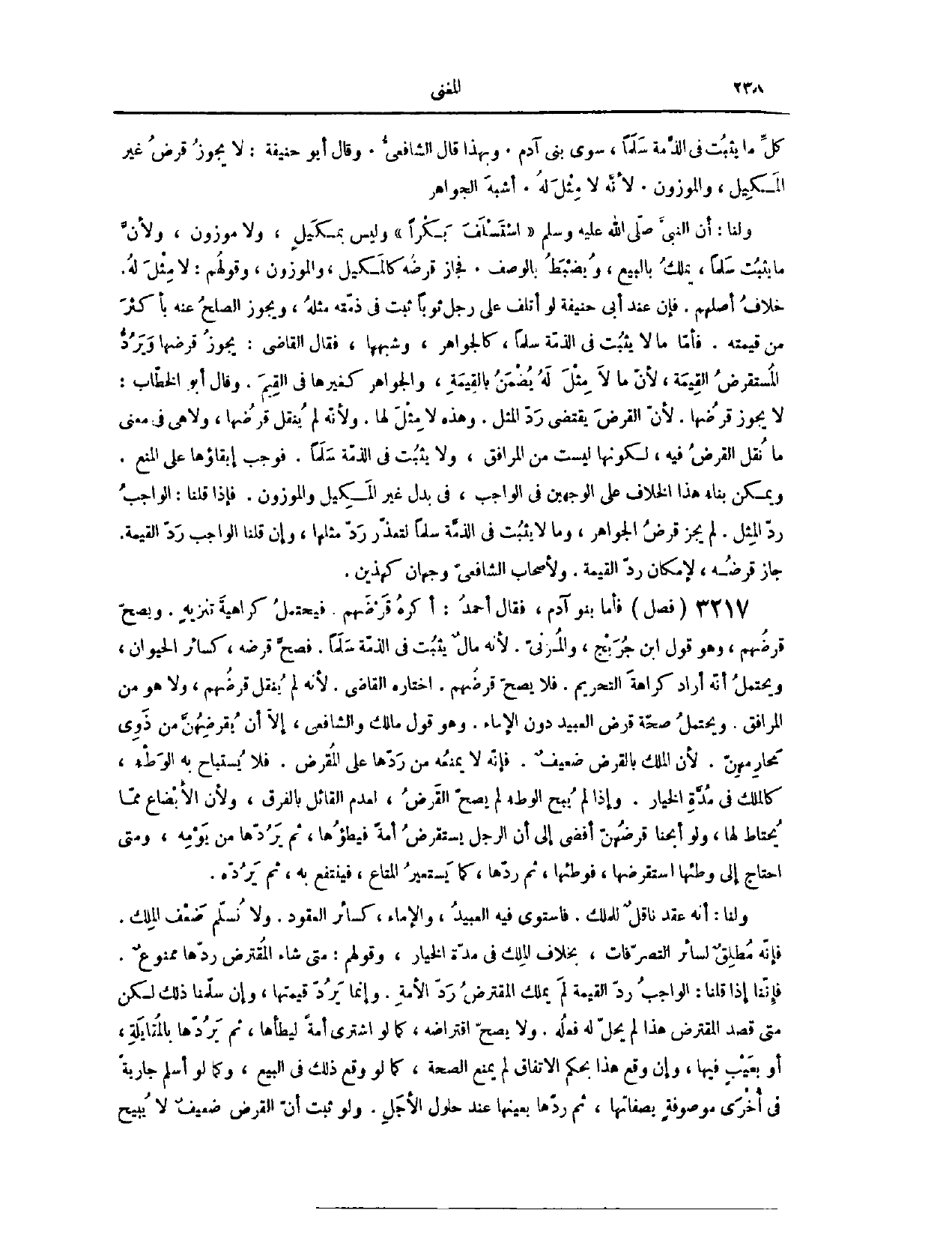(٣٢٥٩) فَصْلٌ: فَأَمَّا بَنُو آدَمَ، فَقَالَ أَحْمَدُ: أَكْرَهُ قَرْضَهُمْ. فَيَحْتَمِلُ كَرَاهِيَةَ تَنْزِيهٍ، وَيَصِحُّ قَرْضُهُمْ، وَهُوَ قَوْلُ ابْنِ جُرَيْجِ، وَالْمَزْنِيِّ؛ لِأَنَّهُ مَالٌ يَثْبُتُ فِي الذِّمَّةِ سَلَمًا، فَصَحَّ قَرْضُهُ، كَسَائِرِ الْحَيَوَانِ. وَيَحْتَمِلُ أَنَّهُ أَرَادَ كَرَاهَةَ التَّحْرِيمِ، فَلَا يَصِحُّ قَرْضُهُمْ. اخْتَارَهُ الْقَاضِي؛ لِأَنَّهُ لَمْ يُنْقَلْ قَرْضُهُمْ، وَلَا هُوَ مِنْ الْمَرَافِقِ. وَيَحْتَمِلُ صِحَّةَ قَرْضِ الْعَبِيدِ دُونَ الْإِمَاء. وَهُوَ قَوْلُ مَالِكٍ وَالشَّافِعِيِّ، إلَّا أَنْ يُقْرِضَهُنَّ مِنْ ذَوِي مَحَارِمِهِنَّ، لِأَنَّ الْمِلْكَ بِالْقَرْضِ ضَعِيفٌ، فَإِنَّهُ لَا يَمْنَعُهُ مِنْ رَدِّهَا عَلَى الْمُقْرِضِ، فَلَا يُسْتَبَاحُ بِهِ الْوَطْءُ، كَالْمِلْكِ فِي مُدَّةِ الْخِيَارِ، وَإِذَا لَمْ يُبَحْ الْوَطْءُ لَمْ يَصِحَّ الْقَرْضُ، لِعَدَمِ الْقَائِلِ بِالْفَرْقِ، وَلِأَنَّ الْأَبْضَاعَ مِمَّا يُحْتَاطُ لَهَا، وَلَوْ أَبَحْنَا قَرْضَهُنَّ، أَفْضَى إلَى أَنَّ الرَّجُلَ يَسْتَقْرِضُ أَمَةً، فَيَطَؤُهَا ثُمَّ يَرُدُّهَا مِنْ يَوْمِهِ، وَمَتَى احْتَاجَ إلَى وَطْئِهَا، اسْتَقْرَضَهَا فَوَطِئَهَا ثُمَّ رَدَّهَا، كَمَا يَسْتَعِيرُ الْمَتَاعَ، فَيَنْتَفِعُ بِهِ ثُمَّ يَرُدُّهُ.