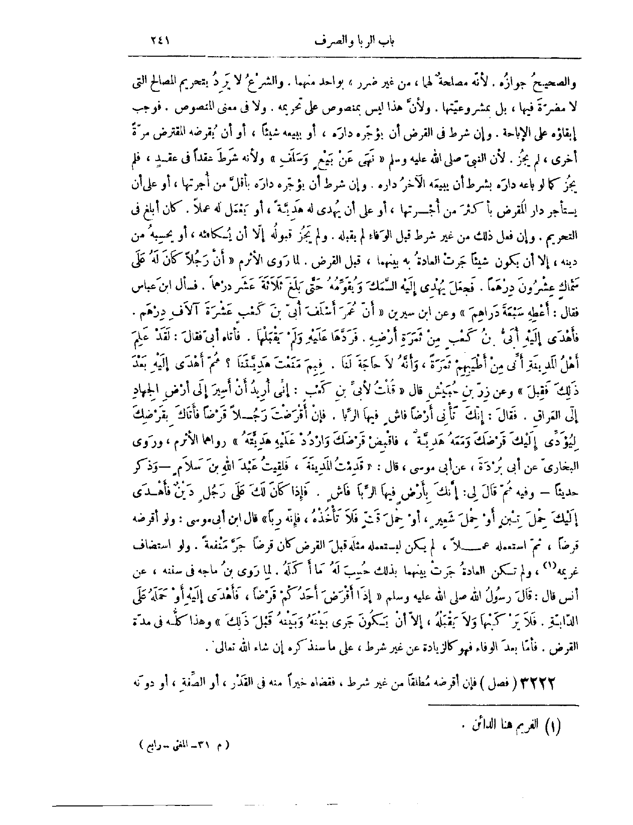 وَعَنْ ابْنِ سِيرِينَ، أَنَّ عُمَرَ أَسْلَفَ أُبَيَّ بْنَ كَعْبٍ عَشَرَةَ آلَافِ دِرْهَمٍ، فَأَهْدَى إلَيْهِ أُبَيّ بْنُ كَعْبٍ مِنْ ثَمَرَةِ أَرْضِهِ، فَرَدَّهَا عَلَيْهِ، وَلَمْ يَقْبَلْهَا، فَأَتَاهُ أُبَيٌّ فَقَالَ: لَقَدْ عَلِمَ أَهْلُ الْمَدِينَةِ أَنِّي مِنْ أَطْيَبِهِمْ ثَمَرَةً، وَأَنَّهُ لَا حَاجَةَ لَنَا فِيمَ مَنَعْت هَدِيَّتَنَا، ثُمَّ أَهْدَى إلَيْهِ بَعْد ذَلِكَ فَقَبِلَ. وَعَنْ زِرِّ بْنِ حُبَيْشٍ، قَالَ: قُلْت لِأُبَيِّ بْنِ كَعْبٍ: إنِّي أُرِيدُ أَنْ أَسِيرَ إلَى أَرْضِ الْجِهَادِ إلَى الْعِرَاقِ. فَقَالَ: إنَّك تَأْتِي أَرْضًا فَاشٍ فِيهَا الرِّبَا، فَإِنْ أَقْرَضْت رَجُلًا قَرْضًا، فَأَتَاك بِقَرْضِك وَمَعَهُ هَدِيَّةٌ، فَاقْبِضْ قَرْضَك، وَارْدُدْ عَلَيْهِ هَدِيَّتَهُ. رَوَاهُمَا الْأَثْرَمُ. وَرَوَى الْبُخَارِيُّ، عَنْ أَبِي بُرْدَةَ، عَنْ أَبِي مُوسَى، قَالَ: قَدِمْت الْمَدِينَةَ، فَلَقِيت عَبْدَ اللَّهِ بْنَ سَلَامٍ. وَذَكَرَ حَدِيثًا. وَفِيهِ: ثُمَّ قَالَ لِي: إنَّك بِأَرْضِ فِيهَا الرِّبَا فَاشٍ، فَإِذَا كَانَ لَك عَلَى رَجُلٍ دَيْنٌ، فَأَهْدَى إلَيْك حِمْلَ تِبْنٍ، أَوْ حِمْلَ شَعِيرٍ، أَوْ حِمْلَ قَتٍّ، فَلَا تَأْخُذْهُ، فَإِنَّهُ رَبًّا. قَالَ ابْنُ أَبِي مُوسَى: وَلَوْ أَقْرَضَهُ قَرْضًا، ثُمَّ اسْتَعْمَلَهُ عَمَلًا، لَمْ يَكُنْ لِيَسْتَعْمِلهُ مِثْلَهُ قَبْلَ الْقَرْضِ، كَانَ قَرْضًا جَرَّ مَنْفَعَةً. وَلَوْ اسْتَضَافَ غَرِيمَهُ، وَلَمْ تَكُنْ الْعَادَةُ جَرَتْ بَيْنَهُمَا بِذَلِكَ، حَسَبِ لَهُ مَا أَكَلَهُ؛ لِمَا رَوَى ابْنُ مَاجَهْ، فِي " سُنَنِهِ "، عَنْ أَنَسٌ قَالَ: قَالَ رَسُولُ اللَّهِ - صَلَّى اللَّهُ عَلَيْهِ وَسَلَّمَ -: «إذَا أَقْرَضَ أَحَدُكُمْ قَرْضًا، فَأَهْدَى إلَيْهِ، أَوْ حَمَلَهُ عَلَى الدَّابَّةِ، فَلَا يَرْكَبْهَا، وَلَا يَقْبَلْهُ، إلَّا أَنْ يَكُونَ جَرَى بَيْنَهُ وَبَيْنَهُ قَبْلَ ذَلِكَ» . وَهَذَا كُلُّهُ فِي مُدَّةِ الْقَرْضِ، فَأَمَّا بَعْدَ الْوَفَاءِ، فَهُوَ كَالزِّيَادَةِ مِنْ غَيْرِ شَرْطٍ، عَلَى مَا سَنَذْكُرُهُ، إنْ شَاءَ اللَّهُ تَعَالَى.