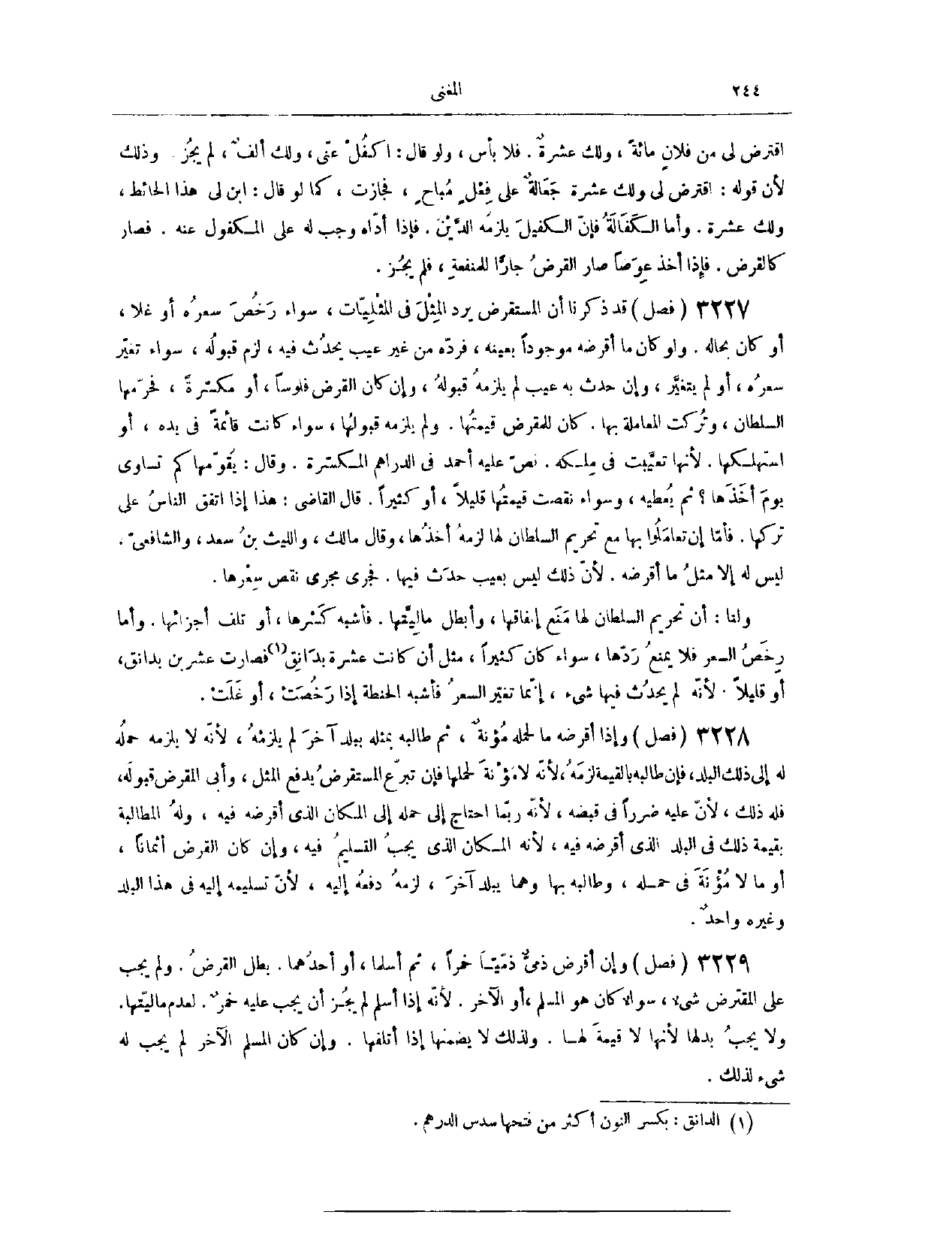 (٣٢٦٩) فَصْلٌ قَدْ ذَكَرْنَا أَنَّ الْمُسْتَقْرِضَ يَرُدُّ الْمِثْلَ فِي الْمِثْلِيَّاتِ، سَوَاءٌ رَخُصَ سِعْرُهُ أَوْ غَلَا، أَوْ كَانَ بِحَالِهِ. وَلَوْ كَانَ مَا أَقْرَضَهُ مَوْجُودًا بِعَيْنِهِ، فَرَدَّهُ مِنْ غَيْرِ عَيْبٍ يَحْدُثُ فِيهِ، لَزِمَ قَبُولُهُ، سَوَاءٌ تَغَيَّرَ سِعْرُهُ أَوْ لَمْ يَتَغَيَّرْ. وَإِنْ حَدَثَ بِهِ عَيْبٌ، لَمْ يَلْزَمْهُ قَبُولُهُ.