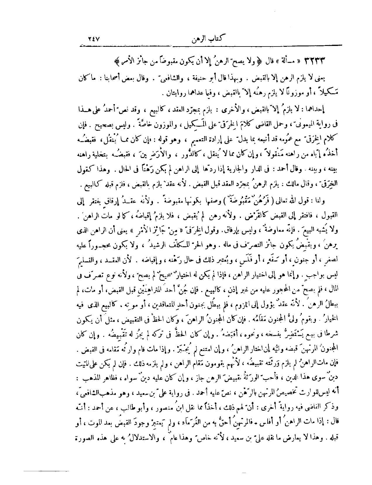 (٣٢٧٥) مَسْأَلَةٌ قَالَ (وَلَا يَصِحُّ الرَّهْنُ إلَّا أَنْ يَكُونَ مَقْبُوضًا مِنْ جَائِزِ الْأَمْرِ) يَعْنِي لَا يَلْزَمُ الرَّهْنُ إلَّا بِالْقَبْضِ. وَبِهَذَا قَالَ أَبُو حَنِيفَةَ وَالشَّافِعِيُّ. وَقَالَ بَعْضُ أَصْحَابِنَا: مَا كَانَ مَكِيلًا أَوْ مَوْزُونًا، لَا يَلْزَمُ رَهْنُهُ إلَّا بِالْقَبْضِ، وَفِيمَا عَدَّاهُمَا رِوَايَتَانِ؛ إحْدَاهُمَا، لَا يَلْزَمُ إلَّا بِالْقَبْضِ.