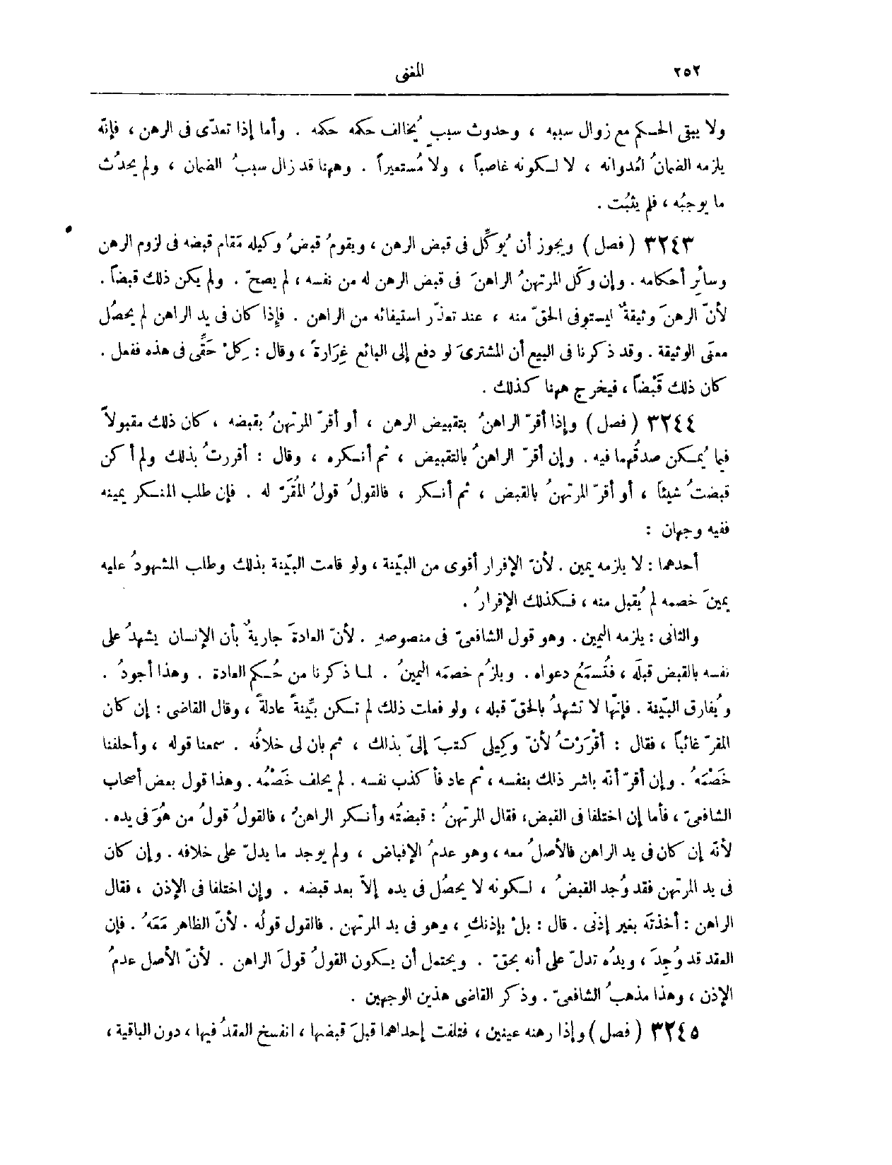 (٣٢٨٦) فَصْلٌ: وَإِذَا أَقَرَّ الرَّاهِنُ بِتَقْبِيضِ الرَّهْنِ، أَوْ أَقَرَّ الْمُرْتَهِنُ بِقَبْضِهِ، كَانَ ذَلِكَ مَقْبُولًا فِيمَا يُمْكِنُ صِدْقُهُمَا فِيهِ. وَإِنْ أَقَرَّ الرَّاهِنُ بِالتَّقْبِيضِ، ثُمَّ أَنْكَرَهُ، وَقَالَ: أَقْرَرْت بِذَلِكَ وَلَمْ أَكُنْ قَبَّضْت شَيْئًا. أَوْ أَقَرَّ الْمُرْتَهِنُ بِالْقَبْضِ، ثُمَّ أَنْكَرَ، فَالْقَوْلُ قَوْلُ الْمُقِرِّ لَهُ، فَإِنْ طَلَبَ الْمُنْكِرُ يَمِينَهُ، فَفِيهِ وَجْهَانِ؛ أَحَدُهُمَا، لَا يَلْزَمُهُ يَمِينٌ؛ لِأَنَّ الْإِقْرَارَ أَقْوَى مِنْ الْبَيِّنَةِ، وَلَوْ قَامَتْ الْبَيِّنَةُ بِذَلِكَ وَطَلَبَ الْمَشْهُودُ عَلَيْهِ يَمِينَ خَصْمِهِ لَمْ يُقْبَلْ مِنْهُ، فَكَذَلِكَ الْإِقْرَارُ.