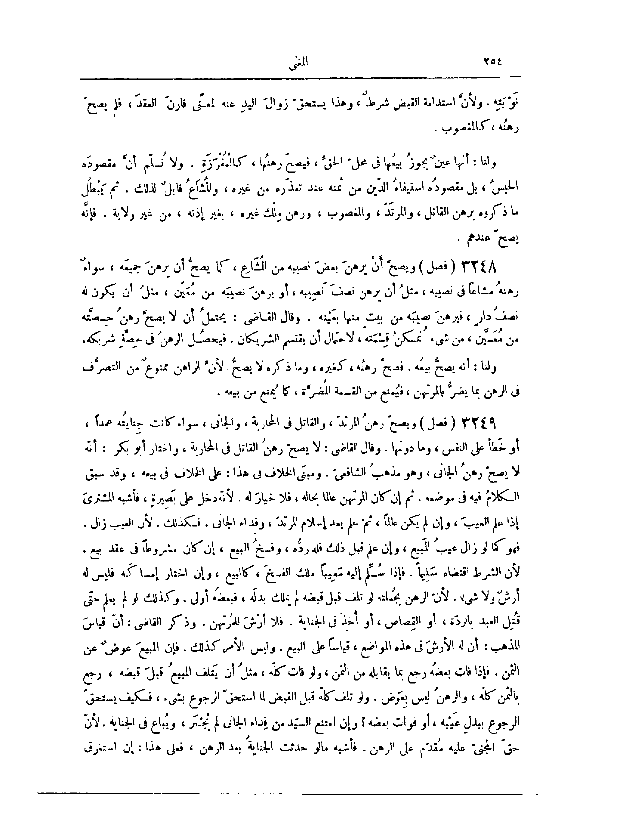 (٣٢٩١) فَصْلٌ: وَيَصِحُّ رَهْنُ الْمُرْتَدِّ وَالْقَاتِلِ فِي الْمُحَارَبَةِ وَالْجَانِي، سَوَاءٌ كَانَتْ جِنَايَتُهُ عَمْدًا أَوْ خَطَأً عَلَى النَّفْسِ وَمَا دُونَهَا. وَقَالَ الْقَاضِي: لَا يَصِحُّ رَهْنُ الْقَاتِلِ فِي الْمُحَارَبَةِ، وَاخْتَارَ أَبُو بَكْرٍ أَنَّهُ لَا يَصِحُّ رَهْنُ الْجَانِي. وَهُوَ مَذْهَبُ الشَّافِعِيِّ، وَمَبْنَى الْخِلَافِ فِي هَذَا عَلَى الْخِلَافِ فِي بَيْعِهِ، وَقَدْ سَبَقَ الْكَلَامُ فِيهِ فِي مَوْضِعِهِ.