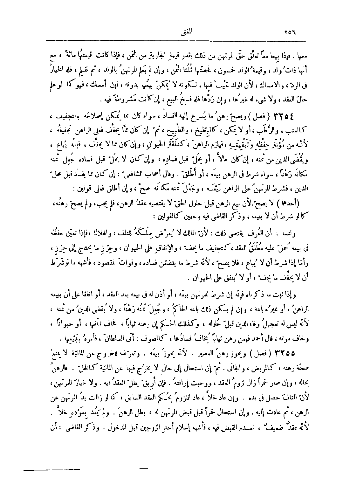 (٣٢٩٧) فَصْلٌ: وَيَصِحُّ رَهْنُ الْعَصِيرِ؛ لِأَنَّهُ يَجُوزُ بَيْعُهُ، وَتَعَرُّضُهُ لِلْخُرُوجِ عَنْ الْمَالِيَّةِ لَا يَمْنَعُ صِحَّةَ رَهْنِهِ، كَالْمَرِيضِ وَالْجَانِي. ثُمَّ إنْ اسْتَحَالَ إلَى حَالٍ لَا يَخْرُجُ فِيهَا عَنْ الْمَالِيَّةِ، كَالْخَلِّ، فَالرَّهْنُ بِحَالِهِ، وَإِنْ صَارَ خَمْرًا زَالَ لُزُومُ الْعَقْدِ، وَوَجَبَتْ إرَاقَتُهُ، فَإِنْ أُرِيقَ بَطَلَ الْعَقْدُ فِيهِ، وَلَا خِيَارَ لِلْمُرْتَهِنِ؛ لِأَنَّ التَّلَفَ حَصَلَ فِي يَدِهِ. وَإِنْ عَادَ خَلًّا، عَادَ اللُّزُومُ، بِحُكْمِ الْعَقْدِ السَّابِقِ، كَمَا لَوْ زَالَتْ يَدُ الْمُرْتَهِنِ عَنْ الرَّهْنِ ثُمَّ عَادَتْ إلَيْهِ. وَإِنْ اسْتَحَالَ خَمْرًا قَبْلَ قَبْضِ الْمُرْتَهِنِ لَهُ، بَطَلَ الرَّهْنُ، وَلَمْ يَعُدْ بِعَوْدِهِ خَلًّا؛ لِأَنَّهُ عَقْدٌ ضَعِيفٌ لِعَدَمِ الْقَبْضِ فِيهِ، فَأَشْبَهَ إسْلَامَ أَحَدِ الزَّوْجَيْنِ قَبْلَ الدُّخُولِ. وَذَكَرَ الْقَاضِي