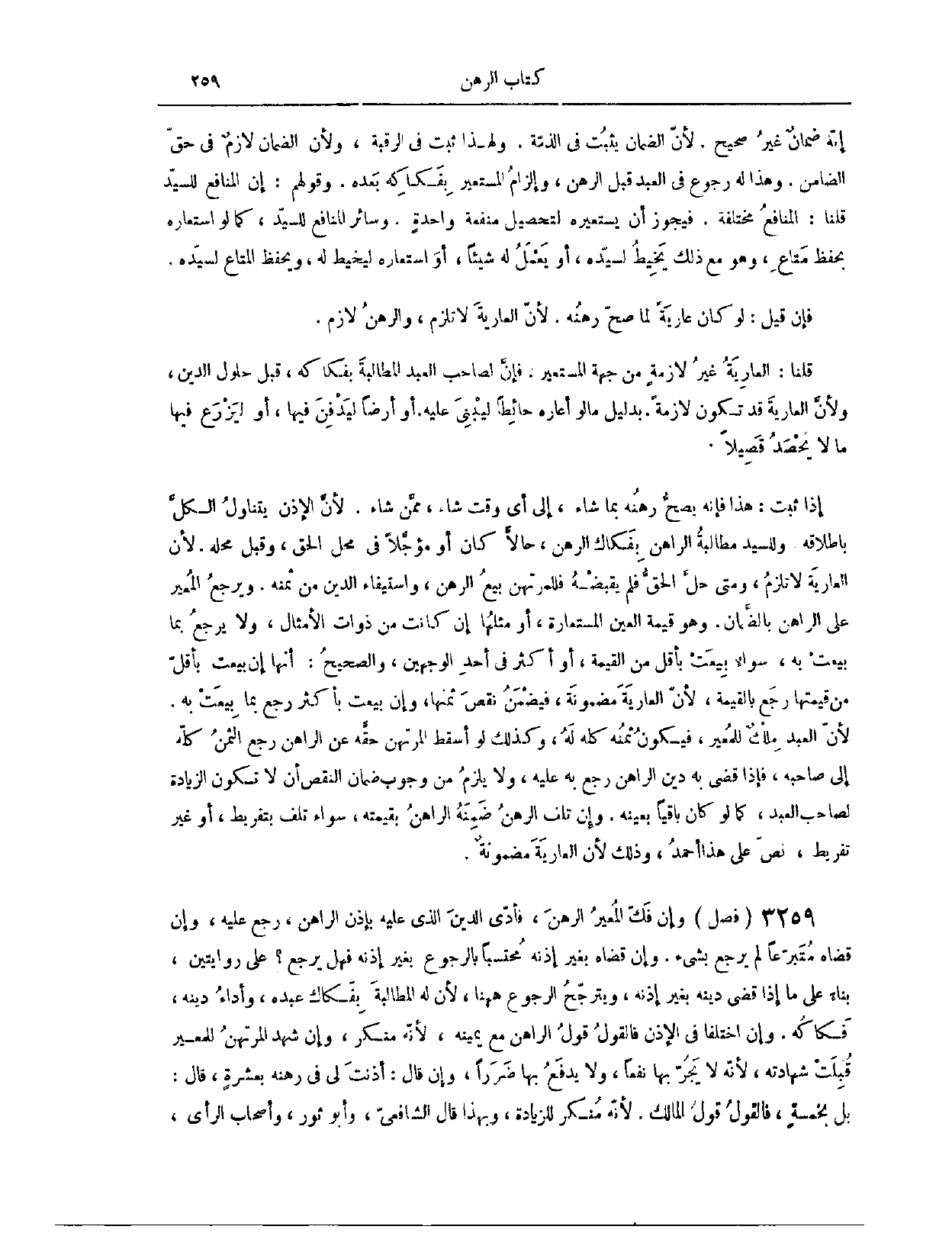 إنَّهُ ضَمَانٌ. غَيْرُ صَحِيحٍ؛ لِأَنَّ الضَّمَانَ يَثْبُتُ فِي الذِّمَّةِ، وَلِهَذَا ثَبَتَ فِي الرَّقَبَةِ، وَلِأَنَّ الضَّمَانَ لَازِمٌ فِي حَقِّ الضَّامِنِ، وَهَذَا لَهُ الرُّجُوعُ فِي الْعَبْدِ قَبْلَ الرَّهْنِ، وَإِلْزَامُ الْمُسْتَعِيرِ بِفِكَاكِهِ بَعْدَهُ.
