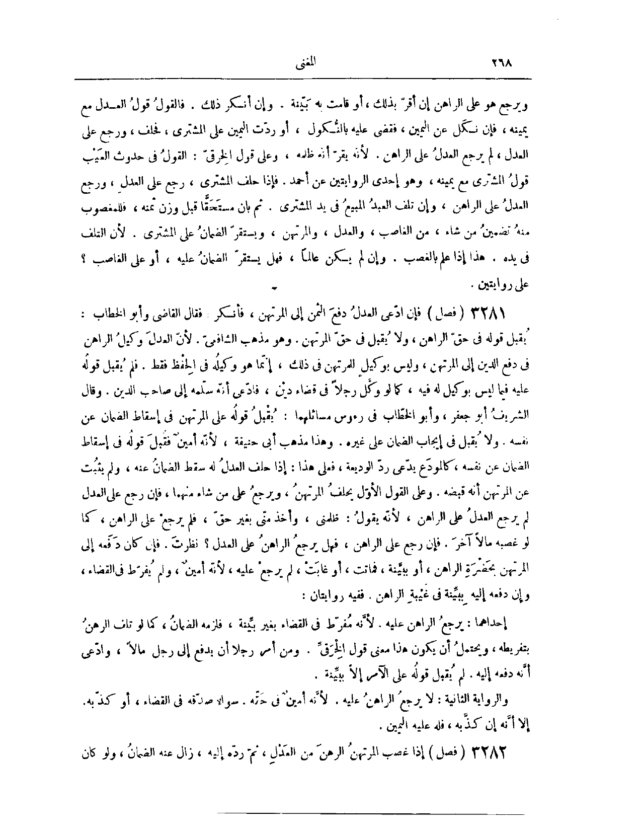 (٣٣٢٣) فَصْلٌ: فَإِنْ ادَّعَى الْعَدْلُ دَفْعَ الثَّمَنِ إلَى الْمُرْتَهِنِ، فَأَنْكَرَ، فَقَالَ الْقَاضِي وَأَبُو الْخَطَّابِ يُقْبَلُ قَوْلُهُ فِي حَقِّ الرَّاهِنِ، وَلَا يُقْبَلُ فِي حَقِّ الْمُرْتَهِنِ. وَهُوَ مَذْهَبُ الشَّافِعِيِّ لِأَنَّ الْعَدْلَ وَكِيلُ الرَّاهِنِ فِي دَفْعِ الدَّيْنِ إلَى الْمُرْتَهِنِ، وَلَيْسَ بِوَكِيلٍ لِلْمُرْتَهِنِ فِي ذَلِكَ، إنَّمَا هُوَ وَكِيلُهُ فِي الْحِفْظِ فَقَطْ، فَلَمْ يُقْبَلْ قَوْلُهُ عَلَيْهِ فِيمَا لَيْسَ بِوَكِيلٍ لَهُ فِيهِ، كَمَا لَوْ وَكَّلَ رَجُلًا فِي قَضَاءِ دَيْنٍ، فَادَّعَى أَنَّهُ سَلَّمَهُ إلَى صَاحِبِ الدَّيْنِ.