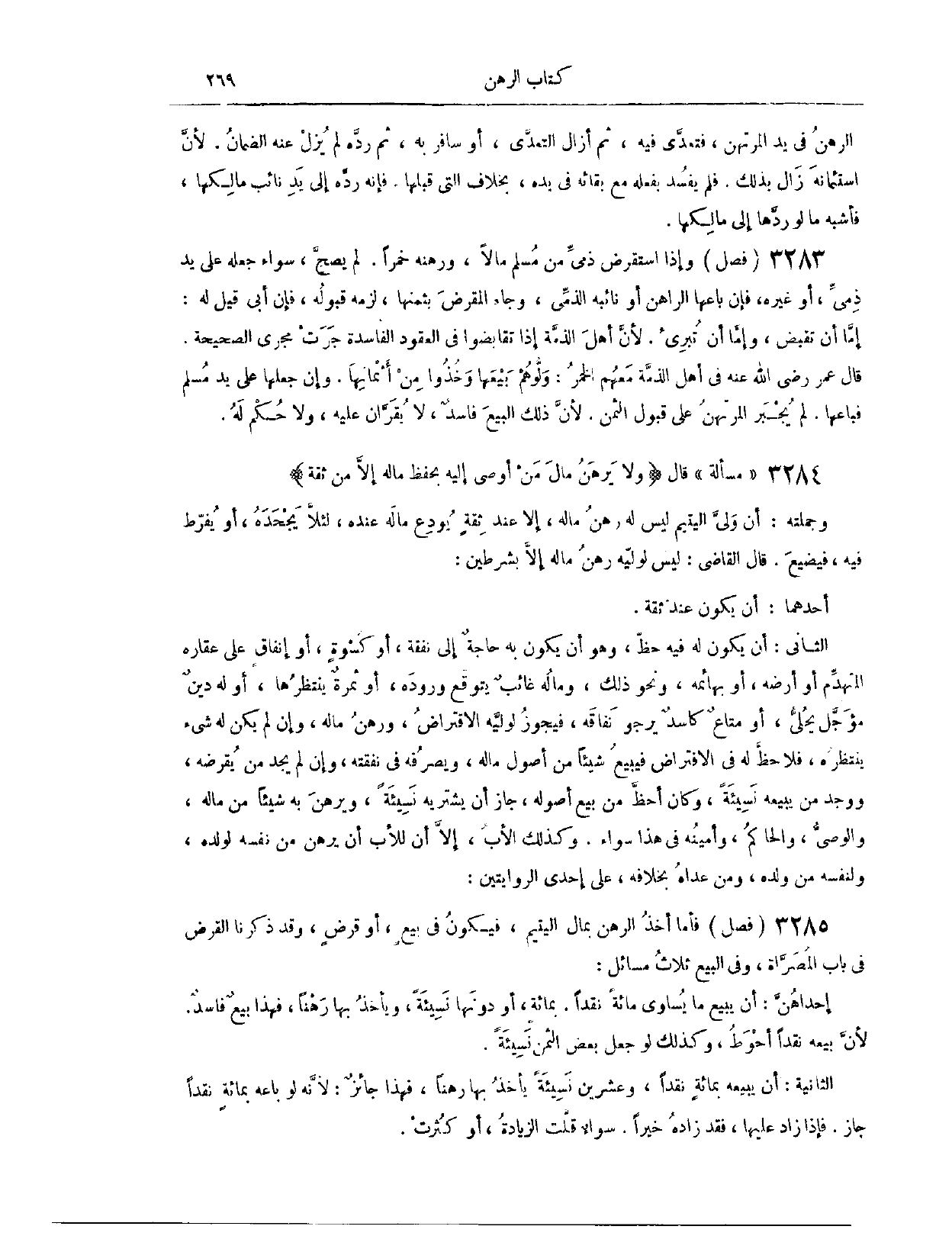 (٣٣٢٧) فَصْلٌ: فَأَمَّا أَخْذُ الرَّهْنِ بِمَالِ الْيَتِيمِ، فَيَكُونُ فِي بَيْعٍ أَوْ قَرْضٍ، وَقَدْ ذَكَرْنَا الْقَرْضَ فِي بَابِ الْمُصَرَّاةِ وَفِي الْبَيْعِ ثَلَاثُ مَسَائِلَ: إحْدَاهُنَّ، أَنْ يَبِيعَ مَا يُسَاوِي مِائَةً نَقْدًا بِمِائَةِ أَوْ دُونهَا نَسِيئَةً، وَيَأْخُذَهَا رَهْنًا، فَهَذَا بَيْعٌ فَاسِدٌ؛ لِأَنَّ بَيْعَهُ نَقْدًا أَحْوَطُ، وَكَذَلِكَ لَوْ جَعَلَ بَعْضَ الثَّمَنِ نَسِيئَةً. الثَّانِيَةُ، أَنْ يَبِيعَهُ بِمِائَةٍ نَقْدًا وَعِشْرِينَ نَسِيئَةً، يَأْخُذُ بِهَا رَهْنًا، فَهَذَا جَائِزٌ؛ لِأَنَّهُ لَوْ بَاعَهُ بِمِائَةٍ نَقْدًا جَازَ، فَإِذَا زَادَ عَلَيْهَا، فَقَدْ زَادَهُ خَيْرًا، سَوَاء قَلَّتْ الزِّيَادَةُ أَوْ كَثُرَتْ.
