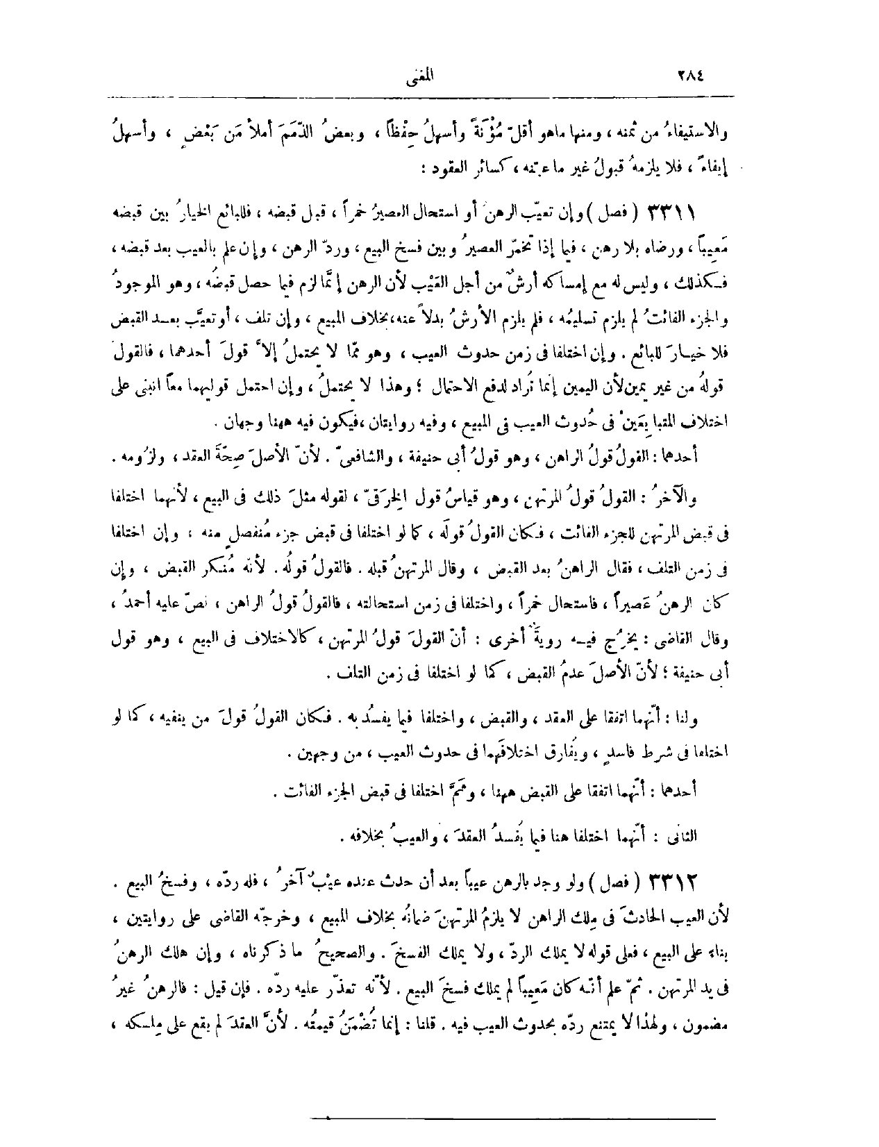 (٣٣٥٨) فَصْلٌ: وَلَوْ وَجَدَ بِالرَّهْنِ عَيْبًا بَعْدَ أَنْ حَدَثَ عِنْدَهُ عَيْبٌ آخَرُ، فَلَهُ رَدُّهُ وَفَسْخُ الْبَيْعِ؛ لِأَنَّ الْعَيْبَ الْحَادِثَ فِي مِلْكِ الرَّاهِنِ لَا يَلْزَمُ الْمُرْتَهِنَ ضَمَانُهُ، بِخِلَافِ الْمَبِيعِ. وَخَرَّجَهُ الْقَاضِي عَلَى رِوَايَتَيْنِ، بِنَاءً عَلَى الْبَيْعِ، فَعَلَى قَوْلِهِ: لَا يَمْلِكُ الرَّدَّ. لَا يَمْلِكُ الْفَسْخَ. وَالصَّحِيحُ مَا ذَكَرْنَاهُ.