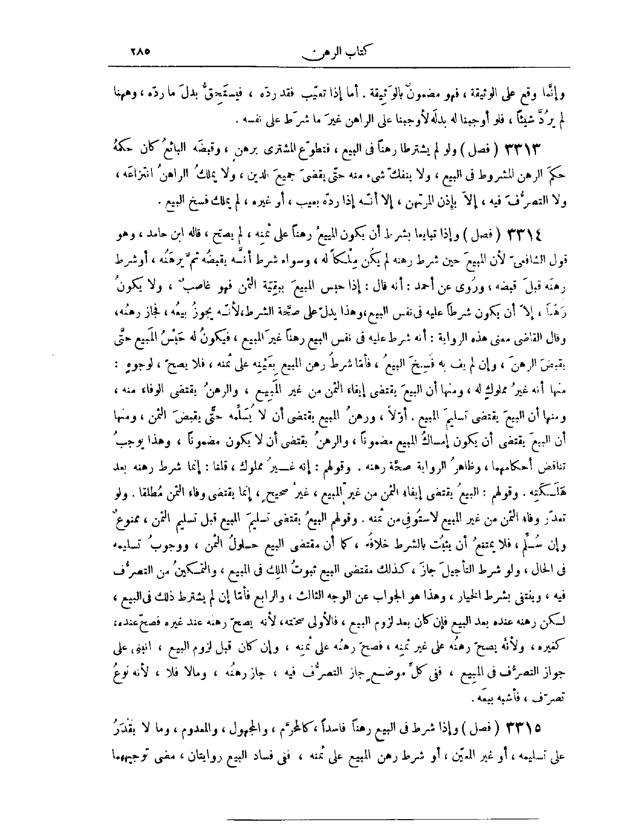 (٣٣٦١) فَصْلٌ: وَإِذَا شَرَطَ فِي الْبَيْعِ رَهْنًا فَاسِدًا كَالْمُحَرَّمِ، وَالْمَجْهُولِ، وَالْمَعْدُومِ، وَمَا لَا يَقْدِرُ عَلَى تَسْلِيمِهِ، أَوْ غَيْرِ الْمُعَيَّنِ، أَوْ شَرَطَ رَهْنَ الْمَبِيعِ عَلَى ثَمَنِهِ، فَفِي فَسَادِ الْبَيْعِ رِوَايَتَانِ، مَضَى تَوْجِيهُهُمَا