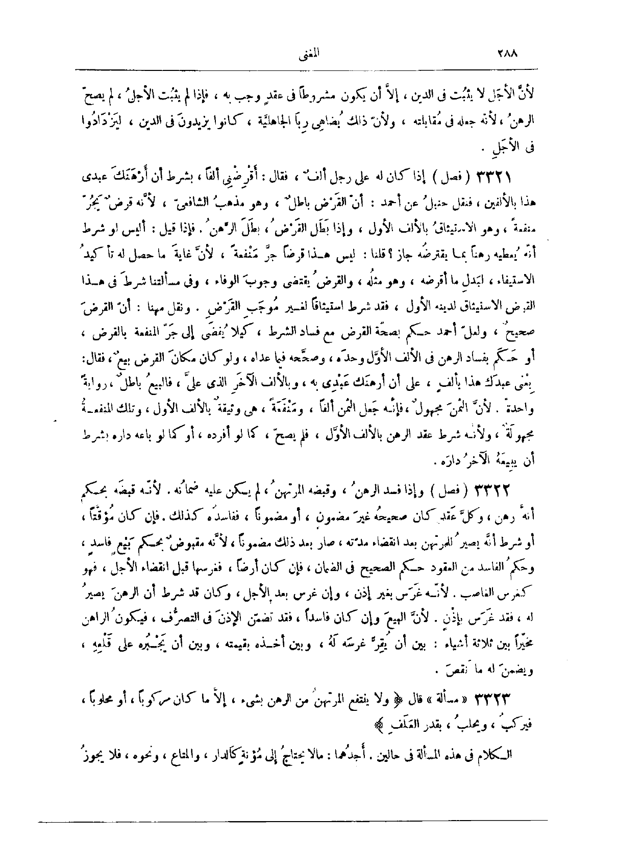(٣٣٦٧) فَصْلٌ: إذَا كَانَ لَهُ عَلَى رَجُلٍ أَلْفٌ، فَقَالَ: أَقْرِضْنِي أَلْفًا، بِشَرْطِ أَنْ أَرْهَنَك عَبْدِي هَذَا بِالْأَلْفَيْنِ فَنَقَلَ حَنْبَلٌ عَنْ أَحْمَدَ، أَنَّ الْقَرْضَ بَاطِلٌ. وَهُوَ مَذْهَبُ الشَّافِعِيِّ؛ لِأَنَّهُ قَرْضٌ يَجُرُّ مَنْفَعَةً، وَهُوَ الِاسْتِيثَاقُ بِالْأَلْفِ الْأَوَّلِ. وَإِذَا بَطَلَ الْقَرْضُ بَطَلَ الرَّهْنُ. فَإِذَا قِيلَ: أَلَيْسَ لَوْ شَرَطَ أَنَّهُ يُعْطِيَهُ رَهْنًا بِمَا يَقْتَرِضُهُ جَازَ؟ قُلْنَا: لَيْسَ هَذَا قَرْضًا جَرَّ مَنْفَعَةً؛ لِأَنَّ غَايَةَ مَا حَصَلَ لَهُ تَأْكِيدُ الِاسْتِيفَاءِ لِبَدَلِ مَا أَقْرَضَهُ، وَهُوَ مِثْلُهُ، وَالْقَرْضُ يَقْتَضِي وُجُوبَ الْوَفَاءِ، وَفِي مَسْأَلَتِنَا شَرَطَ فِي هَذَا الْقَرْضِ الِاسْتِيثَاقَ لِدَيْنِهِ الْأَوَّلِ، فَقَدْ شَرَطَ اسْتِيثَاقًا لِغَيْرِ مُوجِبِ الْقَرْضِ.
