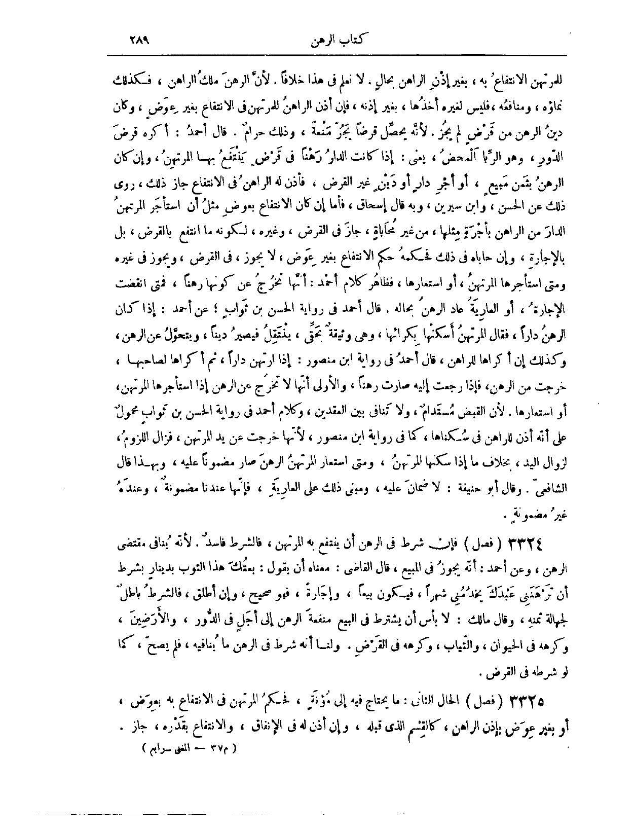 (٣٣٧١) فَصْلٌ: الْحَالُ الثَّانِي مَا يَحْتَاجُ فِيهِ إلَى مُؤْنَةٍ، فَحُكْمُ الْمُرْتَهِنِ فِي الِانْتِفَاعِ بِهِ، بِعِوَضٍ أَوْ بِغَيْرِ عِوَضٍ، بِإِذْنِ الرَّاهِنِ، كَالْقِسْمِ الَّذِي قَبْلَهُ. وَإِنْ أَذِنَ لَهُ فِي الْإِنْفَاقِ وَالِانْتِفَاعِ بِقَدْرِهِ، جَازَ؛