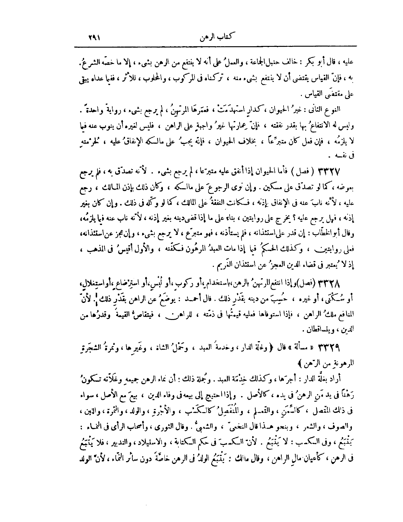 عَلَيْهِ. قَالَ أَبُو بَكْرٍ: خَالَفَ حَنْبَلٌ الْجَمَاعَةَ، وَالْعَمَلُ عَلَى أَنَّهُ لَا يَنْتَفِعُ مِنْ الرَّهْنِ بِشَيْءِ، إلَّا مَا خَصَّهُ الشَّرْعُ بِهِ، فَإِنَّ الْقِيَاسَ يَقْتَضِي أَنْ لَا يَنْتَفِعَ بِشَيْءِ مِنْهُ، تَرَكْنَاهُ فِي الْمَرْكُوبِ وَالْمَحْلُوبِ لِلْأَثَرِ، فَفِيمَا عَدَاهُ يُبْقِي عَلَى مُقْتَضَى الْقِيَاسِ. النَّوْعُ الثَّانِي، غَيْرُ الْحَيَوَانِ، كَدَارٍ اسْتُهْدِمَتْ، فَعَمَرَهَا الْمُرْتَهِنُ، لَمْ يَرْجِعْ بِشَيْءِ. رِوَايَةً وَاحِدَةً. وَلَيْسَ لَهُ الِانْتِفَاعُ بِهَا بِقَدْرِ نَفَقَتِهِ، فَإِنَّ عِمَارَتَهَا غَيْرُ وَاجِبَةٍ عَلَى الرَّاهِنِ، فَلَيْسَ لِغَيْرِهِ أَنْ يَنُوبَ عَنْهُ فِيمَا لَا يَلْزَمُهُ، فَإِنْ فَعَلَ كَانَ مُتَبَرِّعًا، بِخِلَافِ الْحَيَوَانِ، فَإِنَّهُ يَجِبُ عَلَى مَالِكِهِ الْإِنْفَاقُ عَلَيْهِ، لِحُرْمَتِهِ فِي نَفْسِهِ.