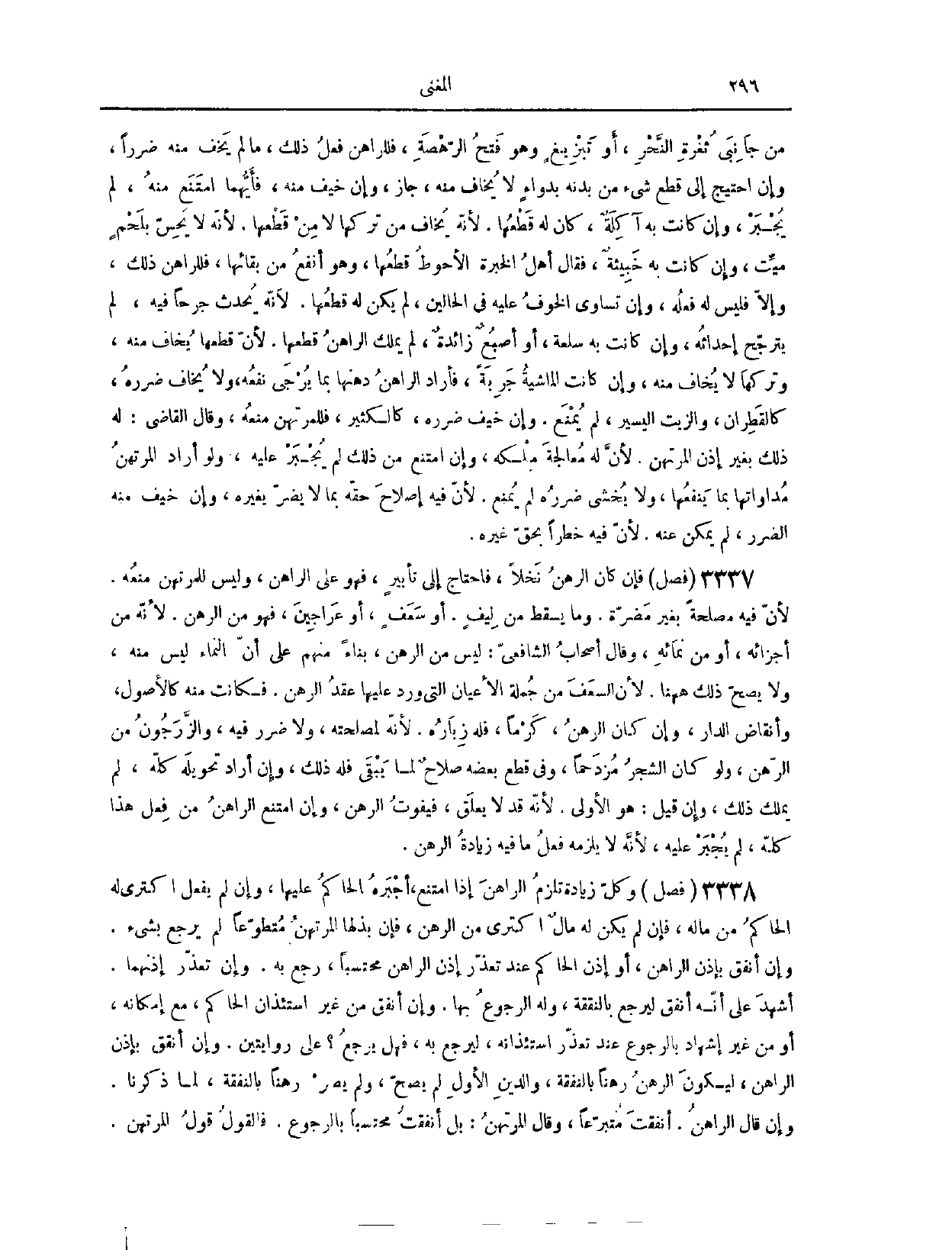 (٣٣٨٣) فَصْلٌ: فَإِنْ كَانَ الرَّهْنُ نَخْلًا، فَاحْتَاجَ إلَى تَأْبِيرٍ، فَهُوَ عَلَى الرَّاهِنِ، وَلَيْسَ لِلْمُرْتَهِنِ مَنْعُهُ؛ لِأَنَّ فِيهِ مَصْلَحَةً بِغَيْرِ مَضَرَّةٍ. وَمَا يَسْقُطُ مِنْ لِيفٍ أَوْ سَعَفٍ أَوْ عَرَاجِينَ، فَهُوَ مِنْ الرَّهْنِ؛ لِأَنَّهُ مِنْ أَجْزَائِهِ، أَوْ مِنْ نَمَائِهِ. وَقَالَ أَصْحَابُ الشَّافِعِيِّ لَيْسَ مِنْ الرَّهْنِ. بِنَاءً مِنْهُمْ عَلَى أَنَّ النَّمَاءَ لَيْسَ مِنْهُ. وَلَا يَصِحُّ ذَلِكَ هَاهُنَا؛ لِأَنَّ السَّعَفَ مِنْ جُمْلَةِ الْأَعْيَانِ الَّتِي وَرَدَ عَلَيْهَا عَقْدُ الرَّهْنِ، فَكَانَتْ مِنْهُ، كَالْأُصُولِ وَأَنْقَاضِ الدَّارِ. وَإِنْ كَانَ الرَّهْنُ كَرْمًا فَلَهُ زِبَارُهُ، لِأَنَّهُ لِمَصْلَحَتِهِ، وَلَا ضَرَرَ فِيهِ. وَالزَّرَجُونُ مِنْ الرَّهْنِ. وَلَوْ كَانَ الشَّجَرُ مُزْدَحِمًا، وَفِي قَطْعِ بَعْضِهِ صَلَاحٌ لِمَا يُبْقِي، فَلَهُ ذَلِكَ. وَإِنْ أَرَادَ تَحْوِيلَهُ كُلَّهُ لَمْ يَمْلِكْ ذَلِكَ. وَإِنْ قِيلَ: هُوَ الْأَوْلَى؛ لِأَنَّهُ قَدْ لَا يَعْلَقُ فَيَفُوتُ الرَّهْنُ. وَإِنْ امْتَنَعَ الرَّاهِنُ مِنْ فِعْلِ هَذَا كُلِّهِ، لَمْ يُجْبَرْ عَلَيْهِ؛ لِأَنَّهُ لَا يَلْزَمُهُ فِعْلُ مَا فِيهِ زِيَادَةٌ مِنْ الرَّهْنِ.