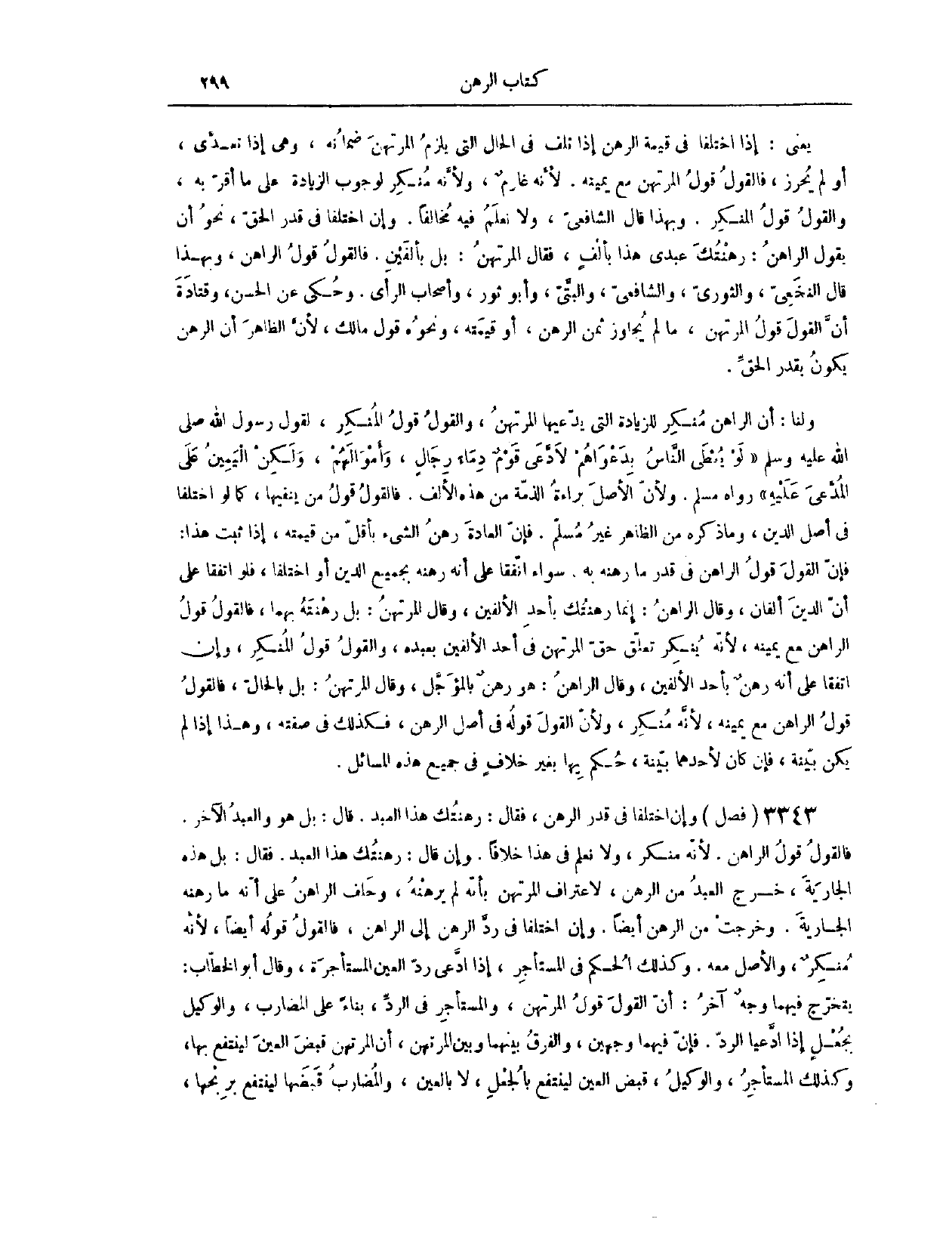 (٣٣٨٩) فَصْلٌ: وَإِنْ اخْتَلَفَا فِي قَدْرِ الرَّهْنِ، فَقَالَ: رَهَنْتُك هَذَا الْعَبْدَ. قَالَ: بَلْ هُوَ وَالْعَبْدَ الْآخَرَ. فَالْقَوْلُ قَوْلُ الرَّاهِنِ؛ لِأَنَّهُ مُنْكِرٌ. وَلَا نَعْلَمُ فِي هَذَا خِلَافًا. وَإِنْ قَالَ: رَهَنْتُك هَذَا الْعَبْدَ. قَالَ: بَلْ هَذِهِ الْجَارِيَةَ. خَرَجَ الْعَبْدُ مِنْ الرَّهْنِ، لِاعْتِرَافِ الْمُرْتَهِنِ بِأَنَّهُ لَمْ يَرْهَنْهُ، وَحَلَفَ الرَّاهِنُ عَلَى أَنَّهُ مَا رَهَنَهُ الْجَارِيَةَ، وَخَرَجَتْ مِنْ الرَّهْنِ أَيْضًا. وَإِنْ اخْتَلَفَا فِي رَدِّ الرَّهْنِ إلَى الرَّاهِنِ، فَالْقَوْلُ قَوْلُهُ أَيْضًا؛ لِأَنَّهُ مُنْكِرٌ، وَالْأَصْلُ مَعَهُ. وَكَذَلِكَ الْحُكْمُ فِي الْمُسْتَأْجِرِ، إذَا ادَّعَى رَدَّ الْعَيْنِ الْمُسْتَأْجَرَةِ. وَقَالَ أَبُو الْخَطَّابِ: يَتَخَرَّجُ فِيهِمَا وَجْهٌ آخَرُ، أَنَّ الْقَوْلَ قَوْلُ الْمُرْتَهِنِ وَالْمُسْتَأْجِرِ فِي الرَّدِّ، بِنَاءً عَلَى الْمُضَارِبِ وَالْوَكِيلِ بِجَعْلٍ، إذَا ادَّعَيَا الرَّدَّ، فَإِنَّ فِيهِمَا وَجْهَيْنِ، وَالْفَرْقُ بَيْنَهُمَا وَبَيْنَ الْمُرْتَهِنِ، أَنَّ الْمُرْتَهِنَ قَبَضَ الْعَيْنَ لِيَنْتَفِعَ بِهَا، وَكَذَلِكَ الْمُسْتَأْجِرُ وَالْوَكِيلُ، قَبَضَ الْعَيْنَ لِيَنْتَفِعَ بِالْجَعْلِ لَا بِالْعَيْنِ، وَالْمُضَارِبُ قَبَضَهَا لِيَنْتَفِعَ بِرِبْحِهَا