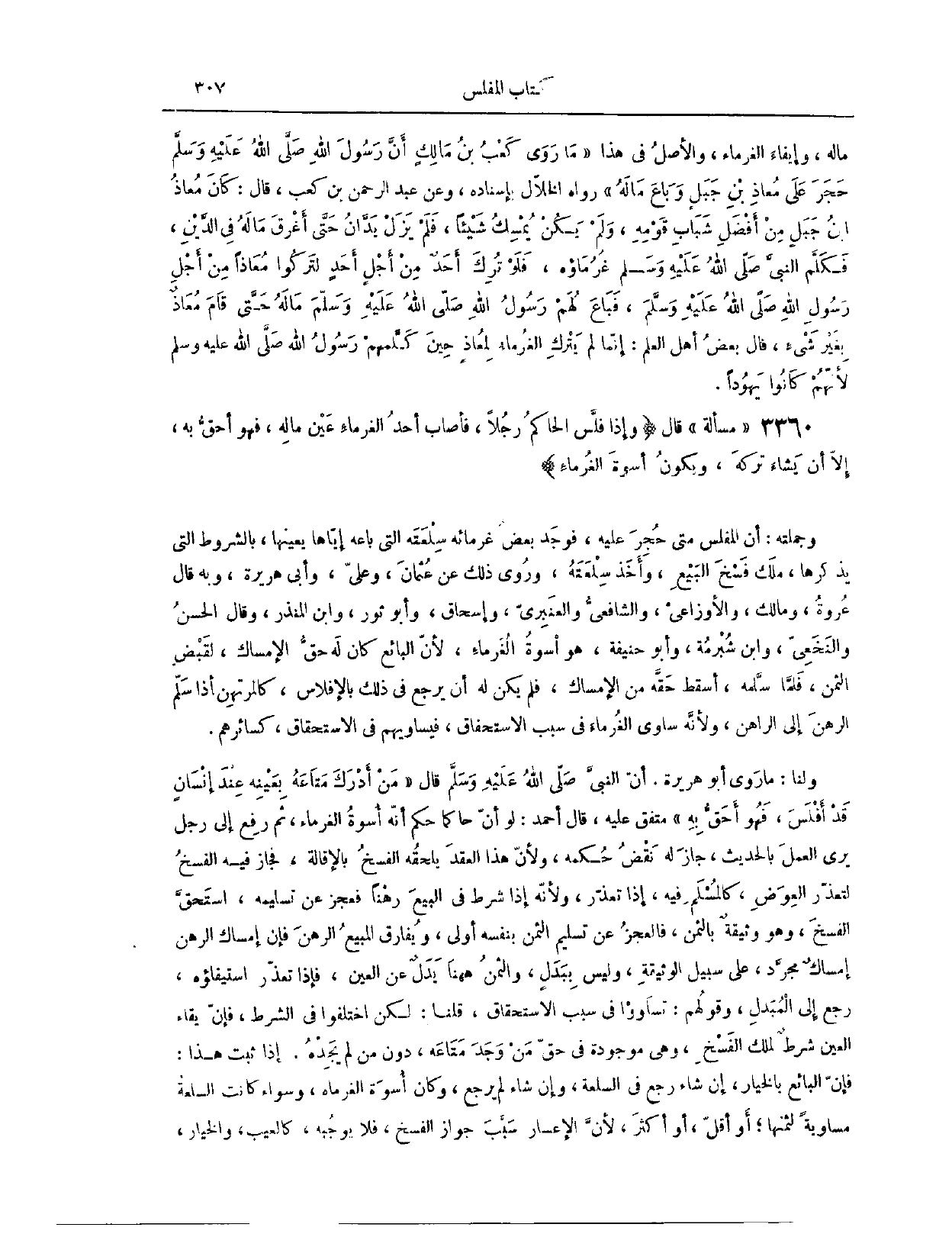 مَالِهِ وَإِيفَاءَ الْغُرَمَاءِ. وَالْأَصْلُ فِي هَذَا مَا رَوَى كَعْبُ بْنُ مَالِكٍ، «أَنَّ رَسُولَ اللَّه - صَلَّى اللَّهُ عَلَيْهِ وَسَلَّمَ - حَجَرَ عَلَى مُعَاذِ بْنِ جَبَلٍ، وَبَاعَ مَالَهُ.» رَوَاهُ الْخَلَّالُ بِإِسْنَادِهِ وَعَنْ عَبْدِ الرَّحْمَنِ بْنِ كَعْبٍ، قَالَ: كَانَ مُعَاذُ بْنُ جَبَلٍ مِنْ أَفْضَلِ شَبَابِ قَوْمِهِ، وَلَمْ يَكُنْ يُمْسِكُ شَيْئًا، فَلَمْ يَزَلْ يُدَانُ حَتَّى أَغْرَقَ مَالَهُ فِي الدَّيْنِ، فَكَلَّمَ النَّبِيَّ - صَلَّى اللَّهُ عَلَيْهِ وَسَلَّمَ - غُرَمَاؤُهُ، فَلَوْ تُرِك أَحَدٌ مِنْ أَجْلِ أَحَدٍ لَتَرَكُوا مُعَاذًا مِنْ أَجْلِ رَسُولِ اللَّهِ - صَلَّى اللَّهُ عَلَيْهِ وَسَلَّمَ - فَبَاعَ لَهُمْ رَسُولُ اللَّهِ - صَلَّى اللَّهُ عَلَيْهِ وَسَلَّمَ - مَالَهُ، حَتَّى قَامَ مُعَاذٌ بِغَيْرِ شَيْءٍ. قَالَ بَعْضُ أَهْلِ الْعِلْمِ: إنَّمَا لَمْ يَتْرُكْ الْغُرَمَاءُ لِمُعَاذٍ حِينَ كَلَّمَهُمْ رَسُولُ اللَّه - صَلَّى اللَّهُ عَلَيْهِ وَسَلَّمَ - لِأَنَّهُمْ كَانُوا يَهُودًا.