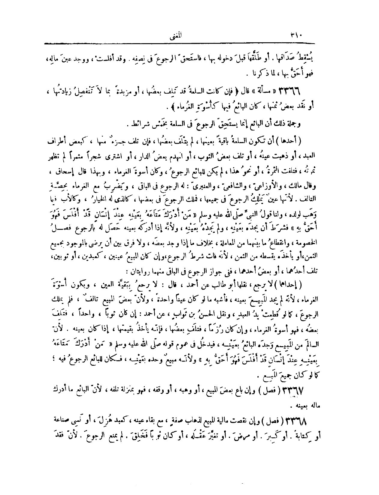(٣٤١٢) مَسْأَلَةٌ؛ قَالَ: (فَإِنْ كَانَتْ السِّلْعَةُ قَدْ تَلِفَ بَعْضُهَا، أَوْ مَزِيدَةً بِمَا لَا تَنْفَصِلُ زِيَادَتُهَا، أَوْ نَقَدَ بَعْضَ ثَمَنِهَا، كَانَ الْبَائِعُ فِيهَا كَأُسْوَةِ الْغُرَمَاءِ) وَجُمْلَةُ ذَلِكَ أَنَّ الْبَائِعَ إنَّمَا يَسْتَحِقُّ الرُّجُوعَ فِي السِّلْعَةِ بِخَمْسِ شَرَائِطَ؛ أَحَدُهَا، أَنْ تَكُونَ السِّلْعَةُ بَاقِيَةً بِعَيْنِهَا، لَمْ يَتْلَفْ بَعْضُهَا، فَإِنْ تَلِفَ جُزْءٌ مِنْهَا كَبَعْضِ أَطْرَافِ الْعَبْدِ، أَوْ ذَهَبَتْ عَيْنُهُ، أَوْ تَلِفَ بَعْضُ الثَّوْبِ، أَوْ انْهَدَمَ بَعْضُ الدَّارِ، أَوْ اشْتَرَى شَجَرًا مُثْمِرًا لَمْ تَظْهَرْ ثَمَرَتُهُ، فَتَلْفِت الثَّمَرَةُ، أَوْ نَحْوُ هَذَا، لَمْ يَكُنْ لِلْبَائِعِ الرُّجُوعُ، وَكَانَ أُسْوَةَ الْغُرَمَاءِ