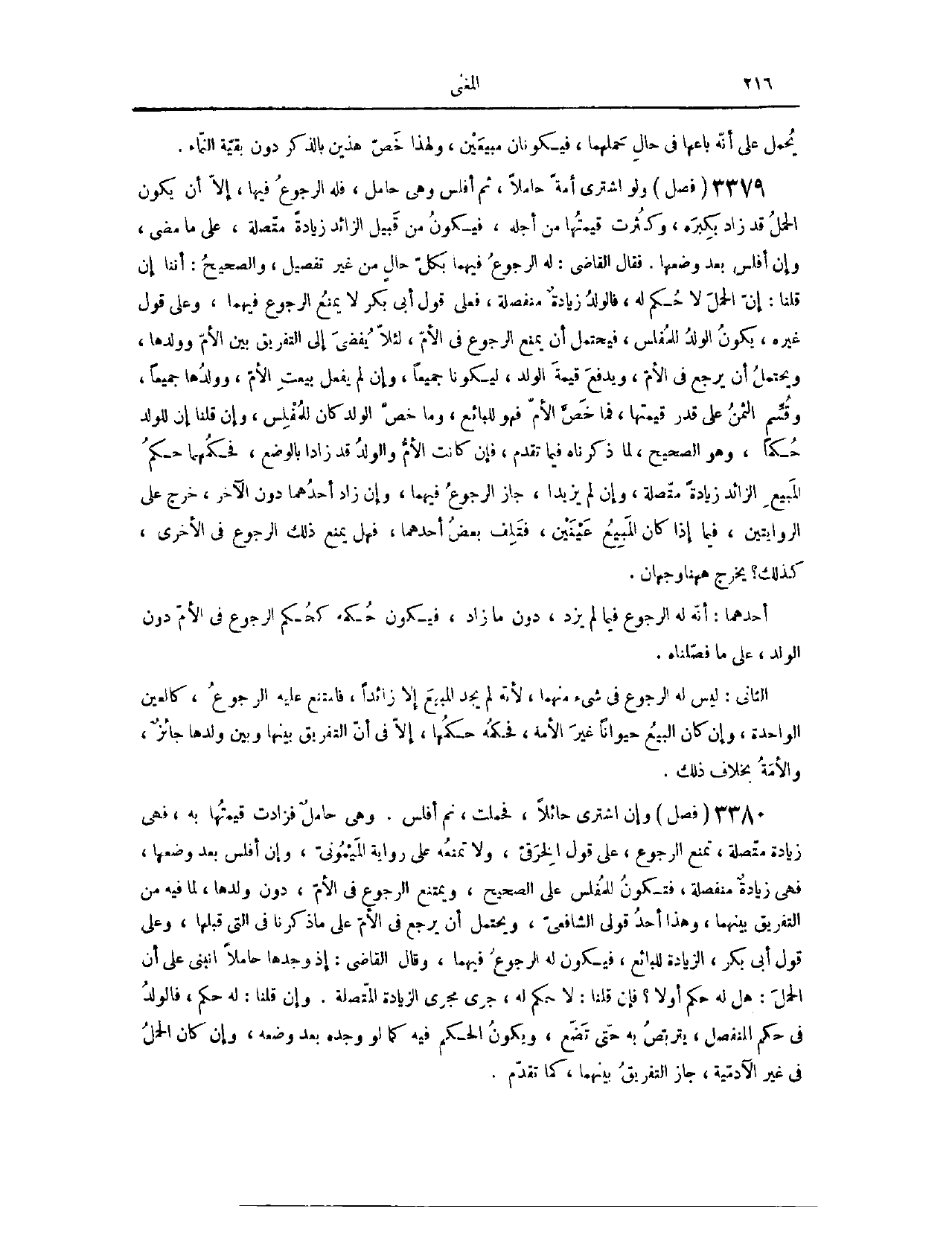 (٣٤٢٦) فَصْلٌ: وَإِنْ اشْتَرَى حَائِلًا، فَحَمَلَتْ، ثُمَّ أَفْلَسَ وَهِيَ حَامِلٌ، فَزَادَتْ قِيمَتُهَا بِهِ، فَهِيَ زِيَادَةٌ مُتَّصِلَةٌ تَمْنَعُ الرُّجُوعَ، عَلَى قَوْلِ الْخِرَقِيِّ، وَلَا تَمْنَعُهُ، عَلَى رِوَايَةِ الْمَيْمُونِي، وَإِنْ أَفْلَسَ بَعْدَ وَضْعِهَا، فَهِيَ زِيَادَةٌ مُنْفَصِلَةٌ، فَتَكُونُ لِلْمُفْلِسِ، عَلَى الصَّحِيحِ. وَيَمْتَنِعُ الرُّجُوعُ فِي الْأُمِّ دُونَ وَلَدِهَا؛ لِمَا فِيهِ مِنْ التَّفْرِيقِ بَيْنَهُمَا. وَهَذَا أَحَدُ قَوْلَيْ الشَّافِعِيِّ. وَيَحْتَمِلُ أَنْ يَرْجِعَ فِي الْأُمِّ، عَلَى مَا ذَكَرْنَا فِي الَّتِي قَبْلَهَا