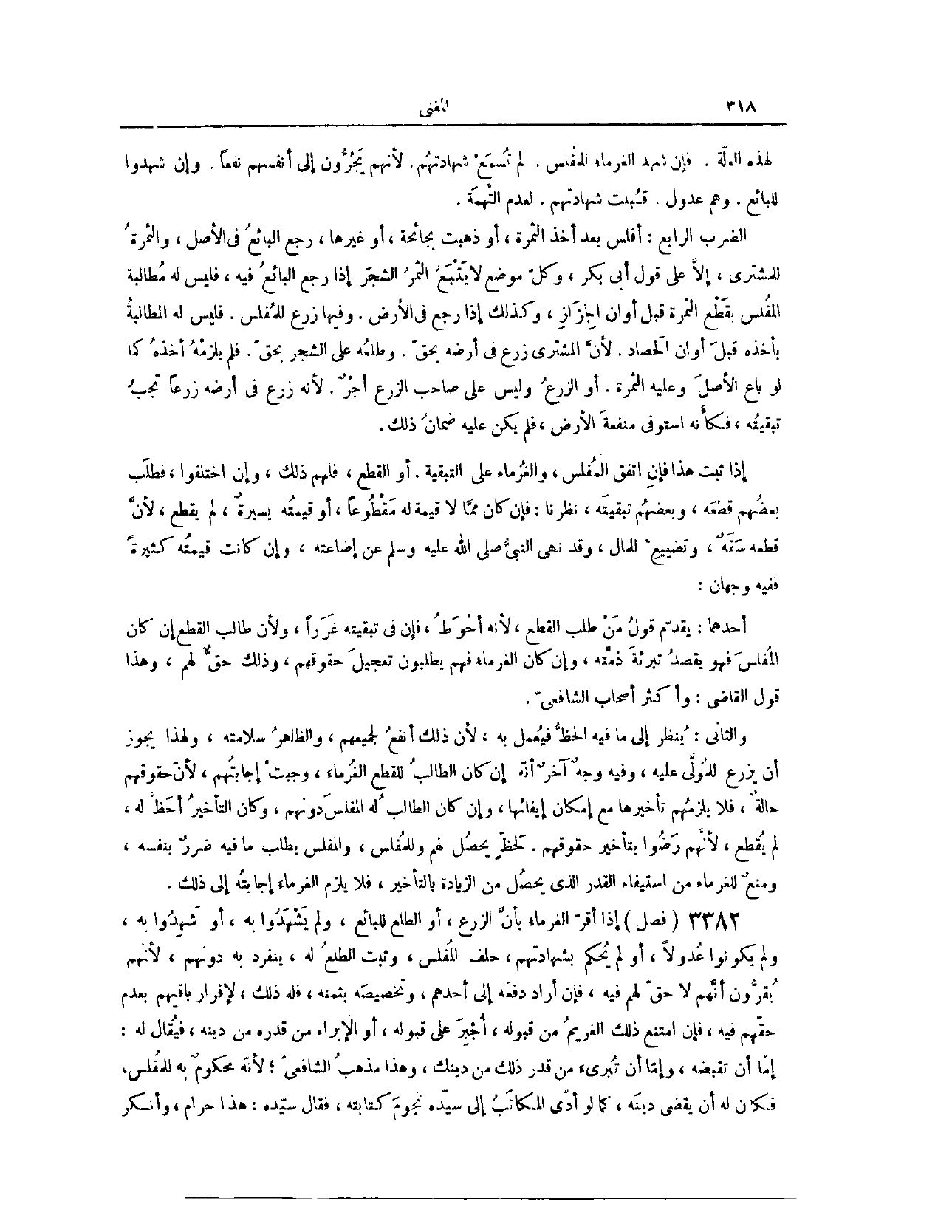 وَهَذَا قَوْلُ الْقَاضِي، وَأَكْثَرِ أَصْحَابِ الشَّافِعِيِّ. وَالثَّانِي، يُنْظَرُ إلَى مَا فِيهِ الْحَظُّ فَيُعْمَلُ بِهِ؛ لِأَنَّ ذَلِكَ أَنْفَعُ لِجَمِيعِهِمْ، وَالظَّاهِرُ سَلَامَتُهُ، وَلِهَذَا يَجُوزُ أَنْ يُزْرَعَ لِلْمُوَلَّى عَلَيْهِ. وَفِيهِ وَجْهٌ آخَرُ أَنَّهُ. إنْ كَانَ الطَّالِبُ لِلْقَطْعِ الْغُرَمَاءَ، وَجَبَتْ إجَابَتُهُمْ؛ لِأَنَّ حُقُوقَهُمْ حَالَّةٌ، فَلَا يَلْزَمُهُمْ تَأْخِيرُهَا مَعَ إمْكَانِ إيفَائِهَا، وَإِنْ كَانَ الطَّالِبُ لَهُ الْمُفْلِسَ دُونَهُمْ، وَكَانَ التَّأْخِيرُ أَحَظَّ لَهُ، لَمْ يَقْطَعْ؛ لِأَنَّهُمْ رَضُوا بِتَأْخِيرِ حُقُوقِهِمْ لِحَظٍّ يَحْصُلُ لَهُمْ وَلِلْمُفْلِسِ، وَالْمُفْلِسُ يَطْلُبُ مَا فِيهِ ضَرَرٌ بِنَفْسِهِ، وَمَنْعٌ لِلْغُرَمَاءِ مِنْ اسْتِيفَاءِ الْقَدْرِ الَّذِي يَحْصُلُ مِنْ الزِّيَادَةِ بِالتَّأْخِيرِ، فَلَا يَلْزَمُ الْغُرَمَاءَ إجَابَتُهُ إلَى ذَلِكَ.