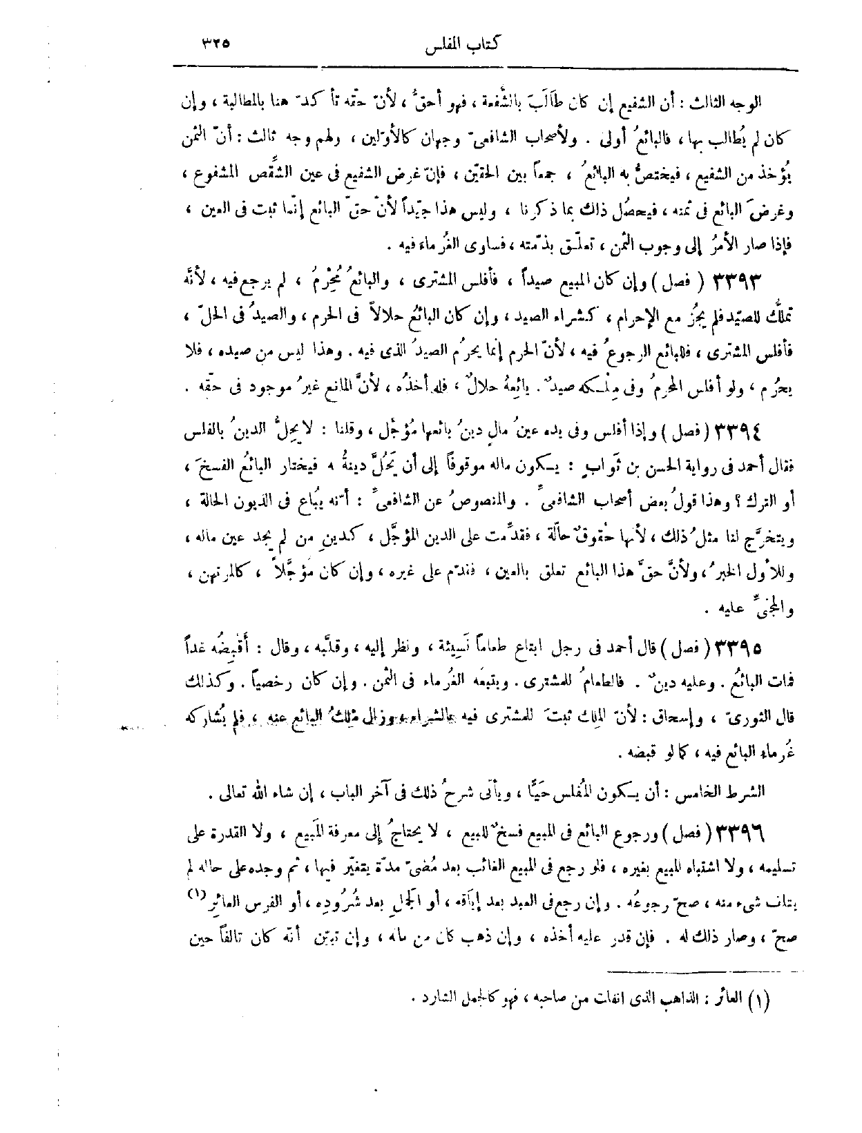 (٣٤٤١) فَصْلٌ: قَالَ أَحْمَدُ، فِي رَجُلٍ ابْتَاعَ طَعَامًا نَسِيئَةً، وَنَظَرَ إلَيْهِ وَقَلَّبَهُ، وَقَالَ: أَقْبِضُهُ غَدًا. فَمَاتَ الْبَائِعُ وَعَلَيْهِ دَيْنٌ، فَالطَّعَامُ لِلْمُشْتَرِي، وَيَتْبَعُهُ الْغُرَمَاءُ فِي الثَّمَنِ، وَإِنْ كَانَ رَخِيصًا. وَكَذَلِكَ قَالَ الثَّوْرِيُّ، وَإِسْحَاقُ، لِأَنَّ الْمِلْكَ ثَبَتَ لِلْمُشْتَرِي فِيهِ بِالشِّرَاءِ، وَزَالَ مِلْكُ الْبَائِعِ عَنْهُ، فَلَمْ يُشَارِكْهُ غُرَمَاءُ الْبَائِعِ فِيهِ، كَمَا لَوْ قَبَضَهُ. الشَّرْطُ الْخَامِسُ، أَنْ يَكُونَ الْمُفْلِسُ حَيًّا. وَيَأْتِي شَرْحُ ذَلِكَ فِي آخِرِ الْبَابِ، إنْ شَاءَ اللَّهُ تَعَالَى.