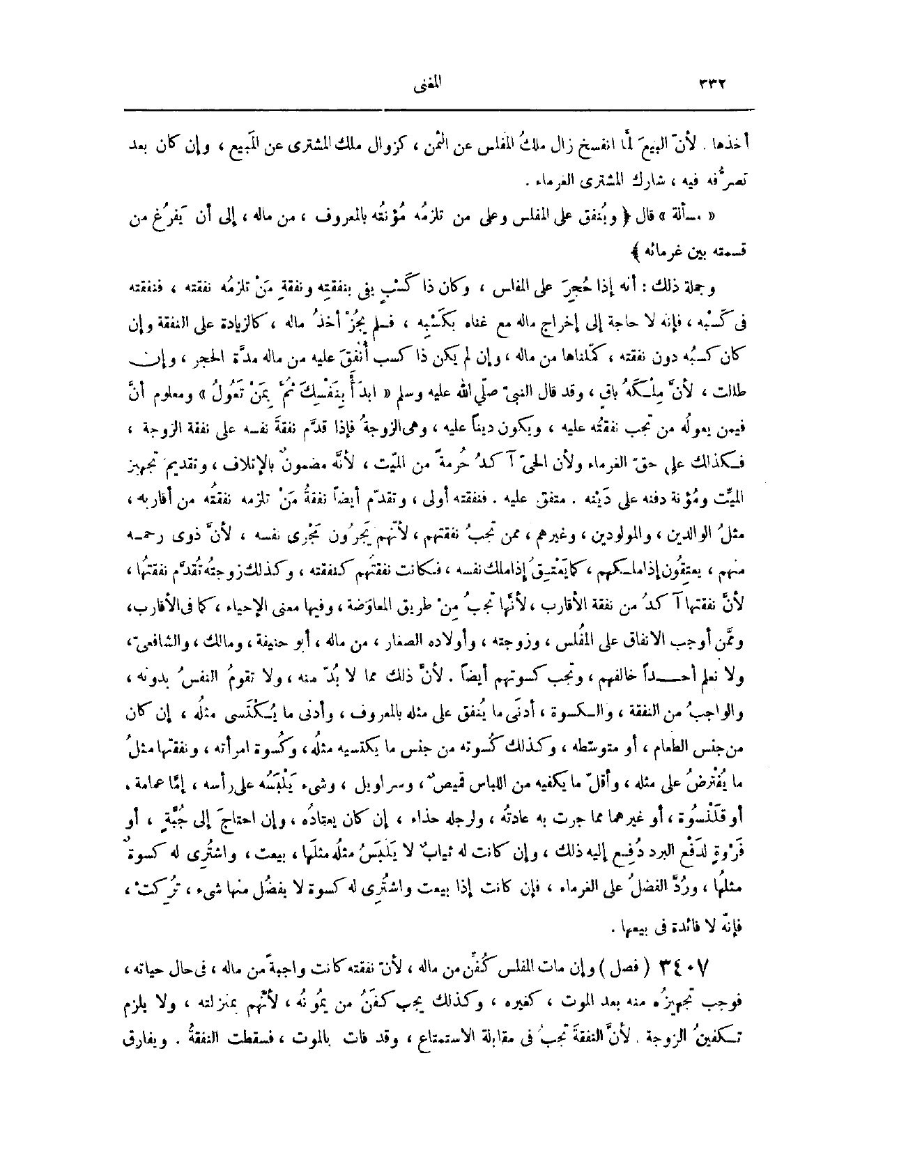 (٣٤٥٤) فَصْلٌ: وَإِنْ مَاتَ الْمُفْلِسُ، كُفِّنَ مِنْ مَالِهِ؛ لِأَنَّ نَفَقَتَهُ كَانَتْ وَاجِبَةً مِنْ مَالِهِ فِي حَالِ حَيَاتِهِ، فَوَجَبَ تَجْهِيزُهُ مِنْهُ بَعْدَ الْمَوْتِ، كَغَيْرِهِ. وَكَذَلِكَ يَجِبُ كَفَنُ مَنْ يُمَوِّنُهُ؛ لِأَنَّهُمْ بِمَنْزِلَتِهِ، وَلَا يَلْزَمُ تَكْفِينُ الزَّوْجَةِ؛ لِأَنَّ النَّفَقَةَ تَجِبُ فِي مُقَابَلَةِ الِاسْتِمْتَاعِ، وَقَدْ فَاتَ بِالْمَوْتِ، فَسَقَطَتْ النَّفَقَةُ. وَيُفَارِقُ