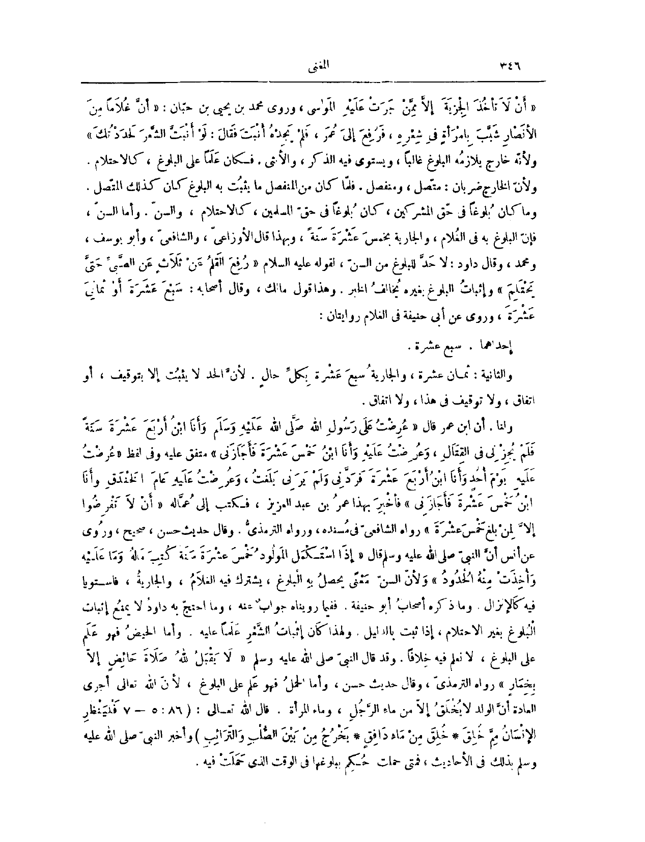 وَمَا كَانَ بُلُوغًا فِي حَقِّ الْمُشْرِكِينَ، كَانَ بُلُوغًا فِي حَقِّ الْمُسْلِمِينَ، كَالِاحْتِلَامِ، وَالسِّنِّ. وَأَمَّا السِّنُّ، فَإِنَّ الْبُلُوغَ بِهِ فِي الْغُلَامِ وَالْجَارِيَةِ بِخَمْسَ عَشْرَةَ سَنَةً. وَبِهَذَا قَالَ الْأَوْزَاعِيُّ، وَالشَّافِعِيُّ وَأَبُو يُوسُفَ وَمُحَمَّدٌ وَقَالَ دَاوُد: لَا حَدَّ لِلْبُلُوغِ مِنْ السِّنِّ، لِقَوْلِهِ - عَلَيْهِ السَّلَامُ -: «رُفِعَ الْقَلَمُ عَنْ ثَلَاثٍ، عَنْ الصَّبِيِّ حَتَّى يَحْتَلِمَ» . وَإِثْبَاتُ الْبُلُوغِ بِغَيْرِهِ يُخَالِفُ الْخَبَرَ. وَهَذَا قَوْلُ مَالِكٍ وَقَالَ أَصْحَابُهُ: سَبْعَ عَشْرَةَ، أَوْ ثَمَانِيَ عَشْرَةَ.