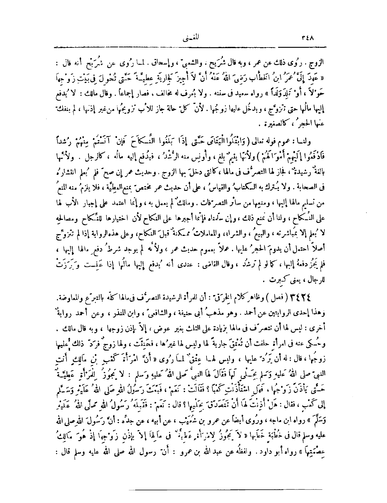 (٣٤٧٤) فَصْلٌ: وَظَاهِرُ كَلَامِ الْخِرَقِيِّ، أَنَّ لِلْمَرْأَةِ الرَّشِيدَةِ التَّصَرُّفَ فِي مَالِهَا كُلِّهِ، بِالتَّبَرُّعِ، وَالْمُعَاوَضَةِ. وَهَذَا إحْدَى الرِّوَايَتَيْنِ عَنْ أَحْمَدَ. وَهُوَ مَذْهَبُ أَبِي حَنِيفَةَ وَالشَّافِعِيِّ وَابْنِ الْمُنْذِرِ. وَعَنْ أَحْمَدَ رِوَايَةٌ أُخْرَى، لَيْسَ لَهَا أَنْ تَتَصَرَّفَ فِي مَالِهَا بِزِيَادَةٍ عَلَى الثُّلُثِ بِغَيْرِ عِوَضٍ، إلَّا بِإِذْنِ زَوْجِهَا. وَبِهِ قَالَ مَالِكٌ.