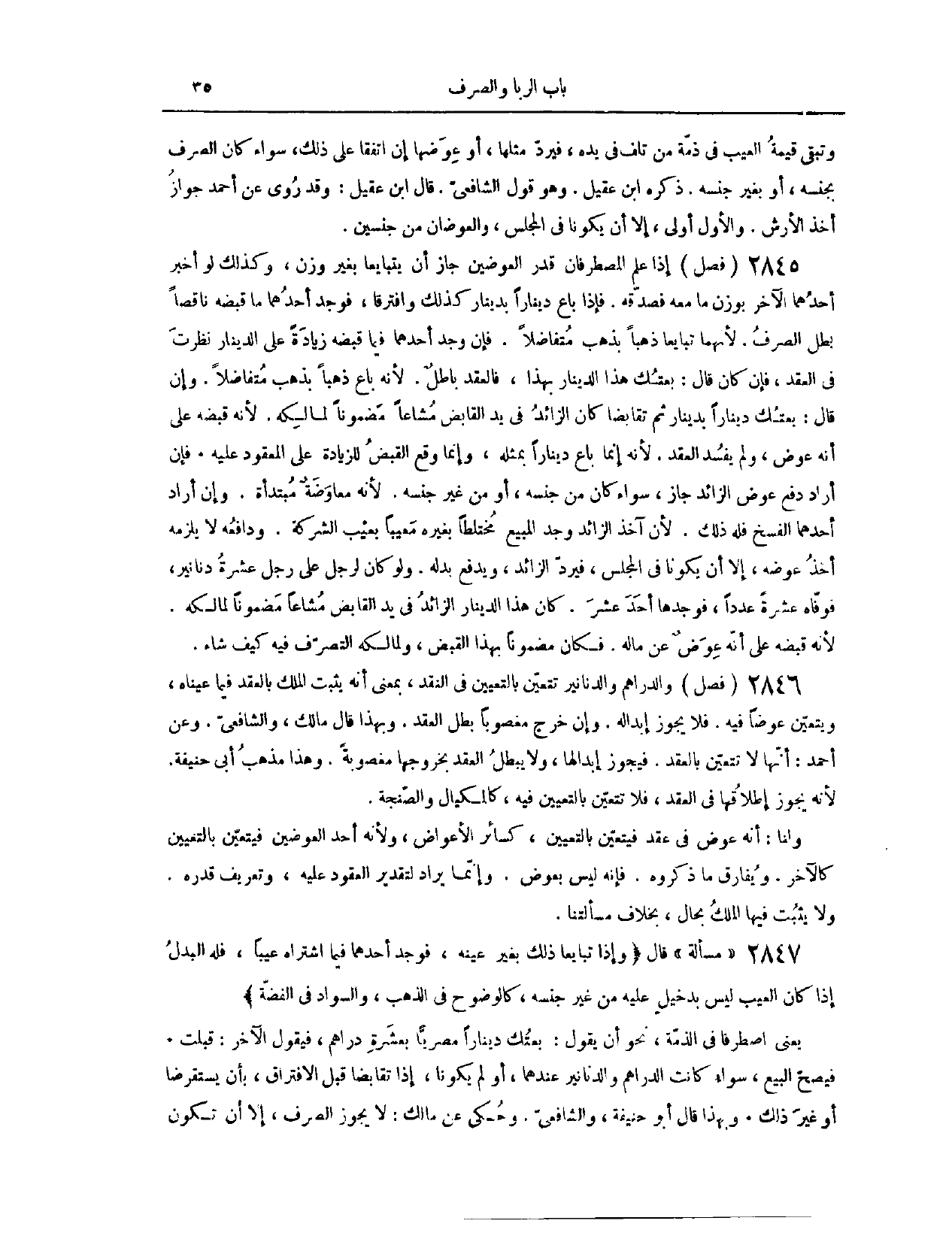 (٢٨٤٩) مَسْأَلَةٌ؛ قَالَ: (وَإِذَا تَبَايَعَا ذَلِكَ بِغَيْرِ عَيْنِهِ، فَوَجَدَ أَحَدُهُمَا فِيمَا اشْتَرَاهُ عَيْبًا، فَلَهُ الْبَدَلُ، إذَا كَانَ الْعَيْبُ لَيْسَ بِدَخِيلٍ عَلَيْهِ مِنْ غَيْرِ جِنْسِهِ، كَالْوُضُوحِ فِي الذَّهَبِ وَالسَّوَادِ فِي الْفِضَّةِ) يَعْنِي اصْطَرَفَا فِي الذِّمَّةِ، نَحْوُ أَنْ يَقُولَ: بِعْتُك دِينَارًا مِصْرِيًّا بِعَشَرَةِ دَرَاهِمَ. فَيَقُولُ الْآخَرُ: قَبِلْت. فَيَصِحُّ الْبَيْعُ، سَوَاءٌ كَانَتْ الدَّرَاهِمُ وَالدَّنَانِيرُ عِنْدَهُمَا، أَوْ لَمْ يَكُونَا، إذَا تَقَابَضَا قَبْلَ الِافْتِرَاقِ، بِأَنْ يَسْتَقْرِضَا أَوْ غَيْرَ ذَلِكَ. وَبِهَذَا قَالَ أَبُو حَنِيفَةَ وَالشَّافِعِيُّ. وَحُكِيَ عَنْ مَالِكٍ، لَا يَجُوزُ الصَّرْفُ، إلَّا أَنْ تَكُونَ
