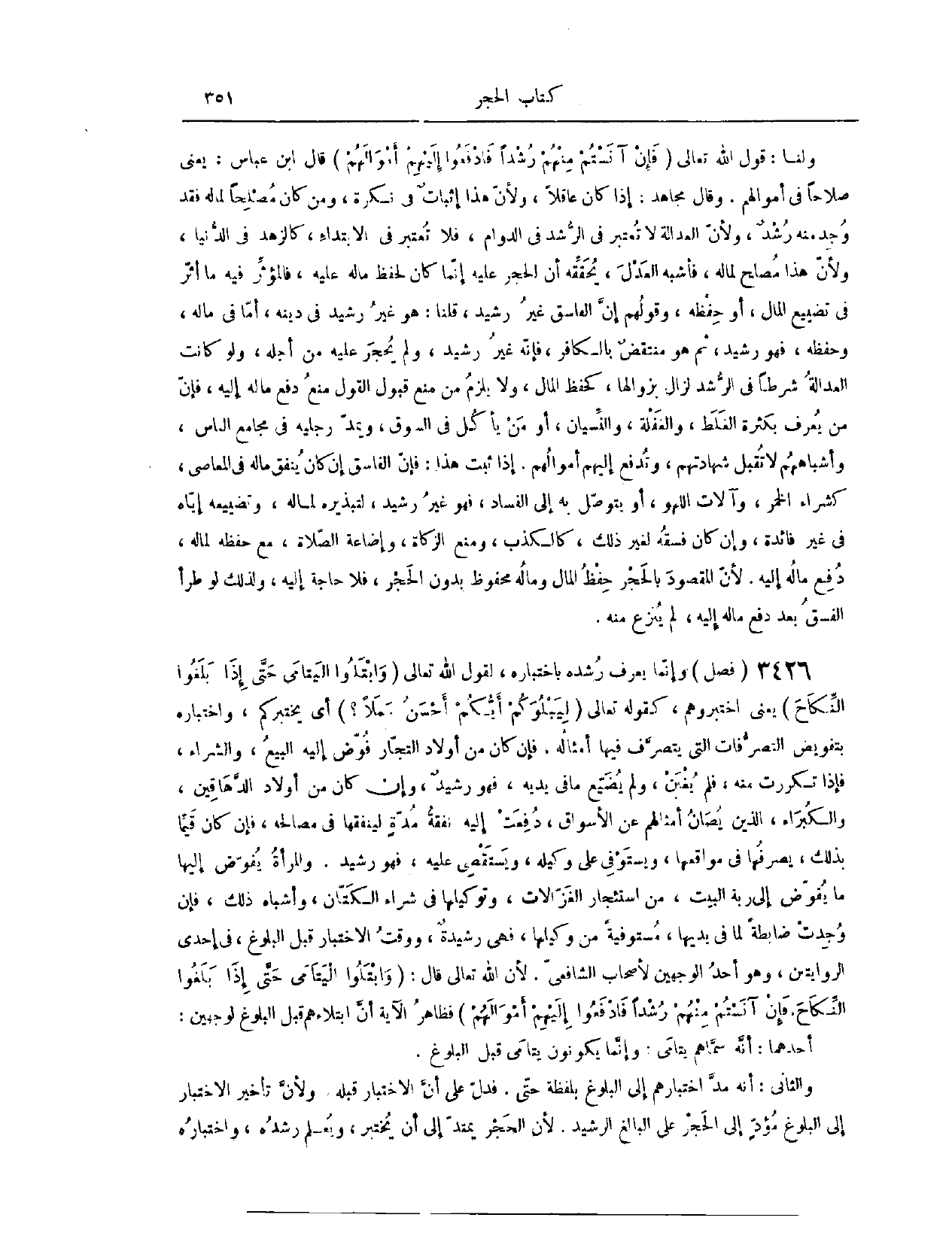 (٣٤٧٧) فَصْلٌ: وَإِنَّمَا يُعْرَفُ رُشْدُهُ بِاخْتِبَارِهِ؛ لِقَوْلِ اللَّهِ تَعَالَى {وَابْتَلُوا الْيَتَامَى حَتَّى إِذَا بَلَغُوا النِّكَاحَ} [النساء: ٦] . يَعْنِي اخْتَبِرُوهُمْ. كَقَوْلِهِ تَعَالَى: {لِيَبْلُوَكُمْ أَيُّكُمْ أَحْسَنُ عَمَلا} [الملك: ٢] أَيْ يَخْتَبِرَكُمْ. وَاخْتِبَارُهُ بِتَفْوِيضِ التَّصَرُّفَاتِ الَّتِي يَتَصَرَّفُ فِيهَا أَمْثَالُهُ إلَيْهِ؛ فَإِنْ كَانَ مِنْ أَوْلَادِ التُّجَّارِ فُوِّضَ إلَيْهِ الْبَيْعُ، وَالشِّرَاءُ، فَإِذَا تَكَرَّرَتْ مِنْهُ، فَلَمْ يَغِبْنَ، وَلَمْ يُضَيِّعْ مَا فِي يَدَيْهِ، فَهُوَ رَشِيدٌ.