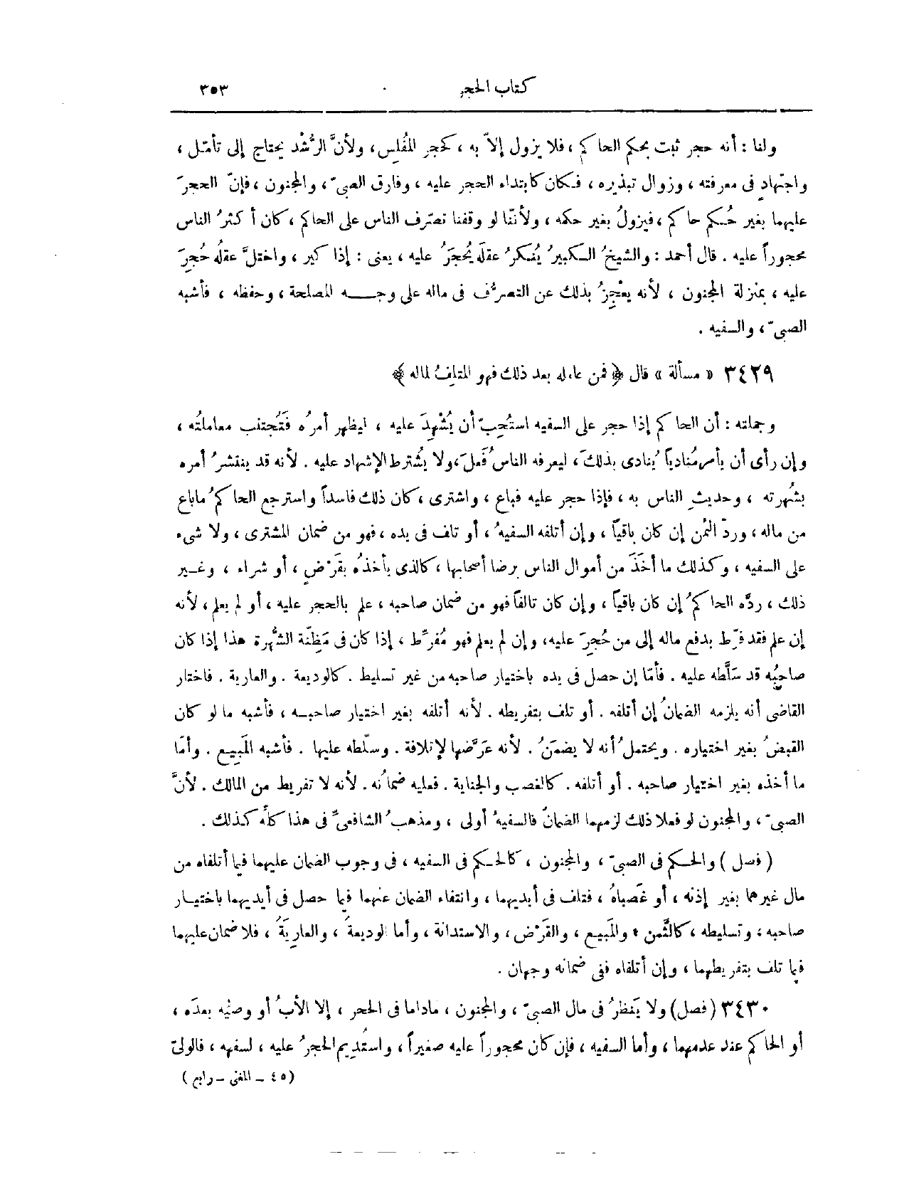 (٣٤٨٠) مَسْأَلَةٌ؛ قَالَ: (فَمَنْ عَامَلَهُ بَعْدَ ذَلِكَ، فَهُوَ الْمُتْلِفُ لِمَالِهِ) وَجُمْلَتُهُ أَنَّ الْحَاكِمَ إذَا حَجَرَ عَلَى السَّفِيهِ، اُسْتُحِبَّ أَنْ يُشْهِدَ عَلَيْهِ، لِيَظْهَرَ أَمْرُهُ، فَتُجْتَنَبَ مُعَامَلَتُهُ. وَإِنْ رَأَى أَنْ يَأْمُرَ مُنَادِيًا يُنَادِي بِذَلِكَ، لِيَعْرِفَهُ النَّاسُ، فَعَلَ.