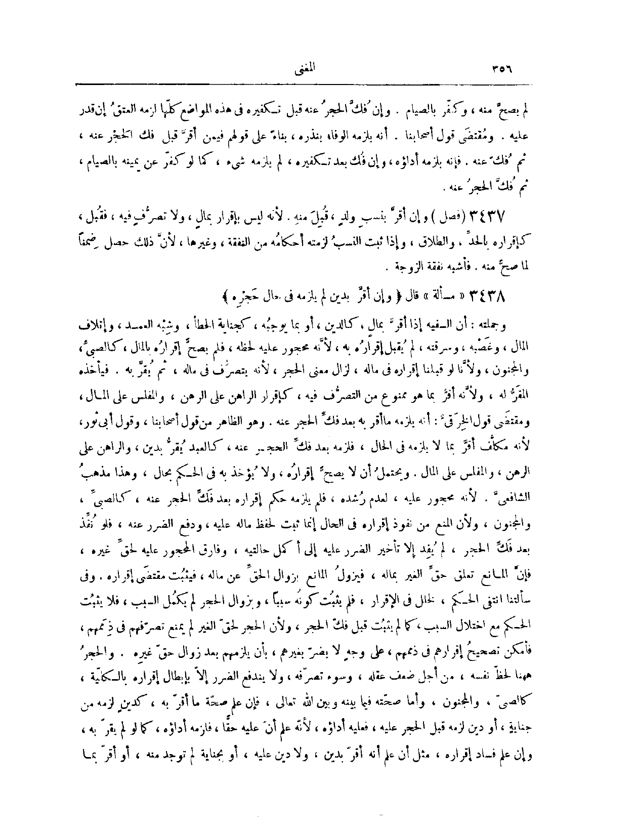 (٣٤٩٠) مَسْأَلَةٌ؛ قَالَ: (وَإِنْ أَقَرَّ بِدَيْنٍ، لَمْ يَلْزَمْهُ فِي حَالِ حَجْرِهِ) وَجُمْلَتُهُ أَنَّ السَّفِيهَ إذَا أَقَرَّ بِمَالٍ، كَالدَّيْنِ، أَوْ بِمَا يُوجِبُهُ، كَجِنَايَةِ الْخَطَإِ وَشِبْهِ الْعَمْدِ، وَإِتْلَافِ الْمَالِ، وَغَصْبِهِ، وَسَرِقَتِهِ، لَمْ يُقْبَلْ إقْرَارُهُ بِهِ؛ لِأَنَّهُ مَحْجُورٌ عَلَيْهِ لِحَظِّهِ، فَلَمْ يَصِحَّ إقْرَارُهُ بِالْمَالِ، كَالصَّبِيِّ وَالْمَجْنُونِ. وَلِأَنَّا لَوْ قَبِلْنَا إقْرَارَهُ فِي مَالِهِ، لَزَالَ مَعْنَى الْحَجْرِ؛ لِأَنَّهُ يَتَصَرَّفُ فِي مَالِهِ، ثُمَّ يُقِرُّ بِهِ، فَيَأْخُذُهُ الْمُقَرُّ لَهُ.