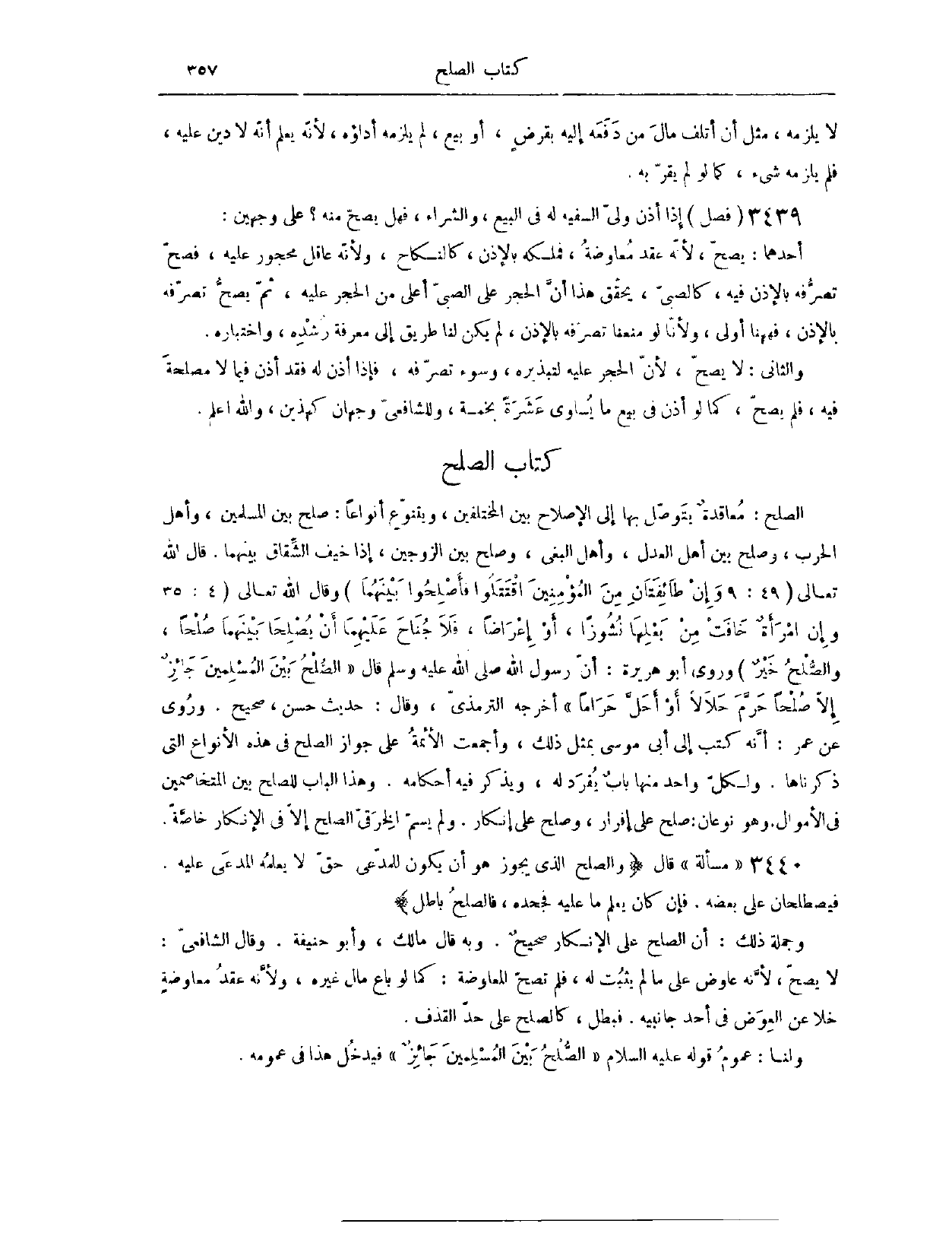 ِ الصُّلْحُ مُعَاقَدَةٌ يُتَوَصَّلُ بِهَا إلَى الْإِصْلَاحِ بَيْنَ الْمُخْتَلِفَيْنِ، وَيَتَنَوَّعُ أَنْوَاعًا؛ صُلْحٌ بَيْنَ الْمُسْلِمِينَ وَأَهْلِ الْحَرْبِ، وَصُلْحٌ بَيْنَ أَهْلِ الْعَدْلِ وَأَهْلِ الْبَغْيِ، وَصُلْحٌ بَيْنَ الزَّوْجَيْنِ إذَا خِيفَ الشِّقَاقُ بَيْنَهُمَا، قَالَ اللَّهُ تَعَالَى: {وَإِنْ طَائِفَتَانِ مِنَ الْمُؤْمِنِينَ اقْتَتَلُوا فَأَصْلِحُوا بَيْنَهُمَا} [الحجرات: ٩] ، وَقَالَ تَعَالَى: {وَإِنِ امْرَأَةٌ خَافَتْ مِنْ بَعْلِهَا نُشُوزًا أَوْ إِعْرَاضًا فَلا جُنَاحَ عَلَيْهِمَا أَنْ يُصْلِحَا بَيْنَهُمَا صُلْحًا وَالصُّلْحُ خَيْرٌ} [النساء: ١٢٨] . وَرَوَى أَبُو هُرَيْرَةَ، أَنَّ رَسُولَ اللَّهِ - صَلَّى اللَّهُ عَلَيْهِ وَسَلَّمَ - قَالَ: «الصُّلْحُ بَيْنَ الْمُسْلِمِينَ جَائِزٌ، إلَّا صُلْحًا حَرَّمَ حَلَالًا أَوْ أَحَلَّ حَرَامًا» . أَخْرَجَهُ التِّرْمِذِيُّ، وَقَالَ: حَدِيثٌ حَسَنٌ صَحِيحٌ. وَرُوِيَ عَنْ عُمَرَ، أَنَّهُ كَتَبَ إلَى أَبِي مُوسَى بِمِثْلِ ذَلِكَ، وَأَجْمَعَتْ الْأُمَّةُ عَلَى جَوَازِ الصُّلْحِ فِي هَذِهِ الْأَنْوَاعِ الَّتِي ذَكَرْنَاهَا، وَلِكُلِّ وَاحِدٍ مِنْهَا بَابٌ يُفْرَدُ لَهُ، يَذْكُرُ فِيهِ أَحْكَامُهُ. وَهَذَا الْبَابُ لِلصُّلْحِ بَيْنَ الْمُتَخَاصِمَيْنِ فِي الْأَمْوَالِ، وَهُوَ نَوْعَانِ؛ صُلْحٌ عَلَى إقْرَارٍ، وَصُلْحٌ عَلَى إنْكَارٍ. وَلَمْ يُسَمِّ الْخِرَقِيِّ الصُّلْحَ إلَّا فِي الْإِنْكَارِ خَاصَّةً.