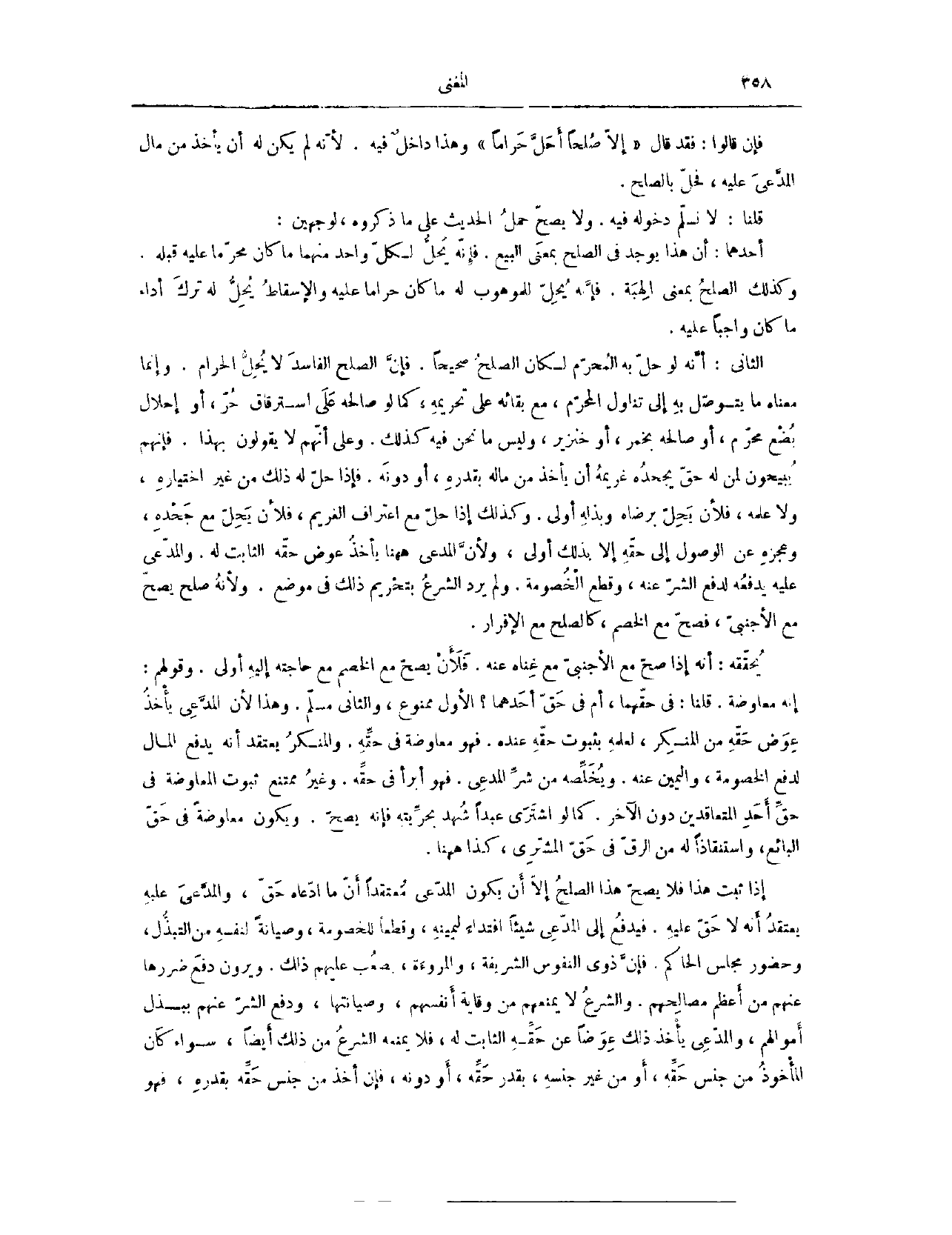 فَإِنْ قَالُوا: فَقَدْ قَالَ: «إلَّا صُلْحًا أَحَلَّ حَرَامًا» . وَهَذَا دَاخِلٌ فِيهِ؛ لِأَنَّهُ لَمْ يَكُنْ لَهُ أَنْ يَأْخُذَ مِنْ مَالِ الْمُدَّعَى عَلَيْهِ، فَحَلَّ بِالصُّلْحِ. قُلْنَا: لَا نُسَلِّمُ دُخُولَهُ فِيهِ، وَلَا يَصِحُّ حَمْلُ الْحَدِيثِ عَلَى مَا ذَكَرُوهُ لِوَجْهَيْنِ؛ أَحَدُهُمَا، أَنَّ هَذَا يُوجَدُ فِي الصُّلْحِ بِمَعْنَى الْبَيْعِ، فَإِنَّهُ يُحِلُّ لِكُلِّ وَاحِدٍ مِنْهُمَا مَا كَانَ مُحَرَّمًا عَلَيْهِ قَبْلَهُ، وَكَذَلِكَ الصُّلْحُ بِمَعْنَى الْهِبَةِ، فَإِنَّهُ يُحِلُّ لِلْمَوْهُوبِ لَهُ مَا كَانَ حَرَامًا عَلَيْهِ، الْإِسْقَاطُ يُحِلُّ لَهُ تَرْكَ أَدَاءِ مَا كَانَ وَاجِبًا عَلَيْهِ.